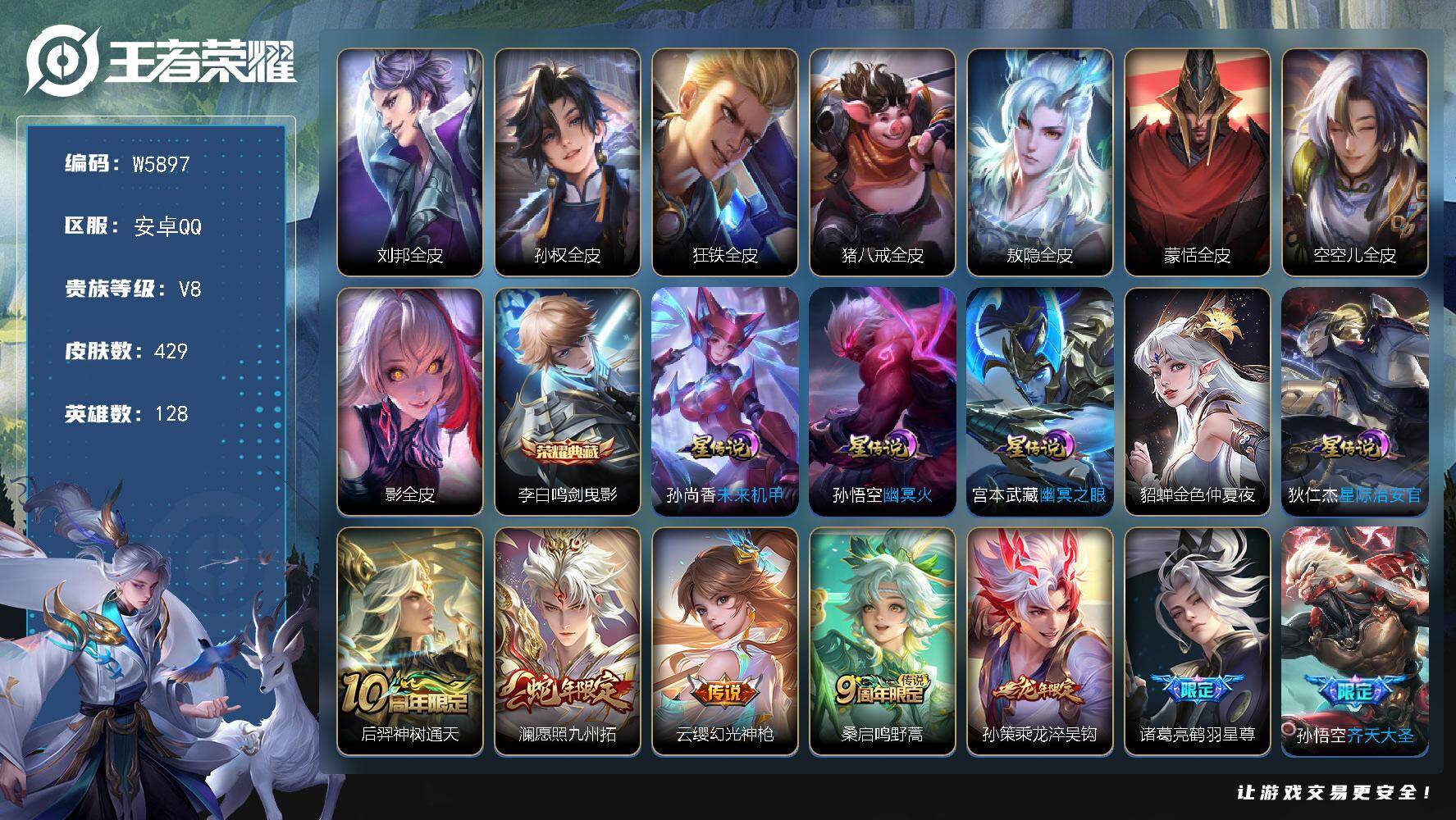 【W5903】安卓QQ-有二次-贵8-128英雄-425皮肤-2典藏-1珍品传