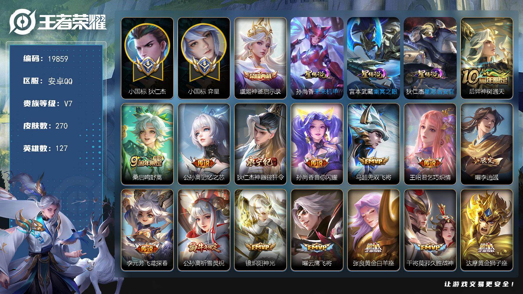 安卓Q-V5-永恒钻石I段位-125英雄-165皮肤-3传说-37史诗【传说