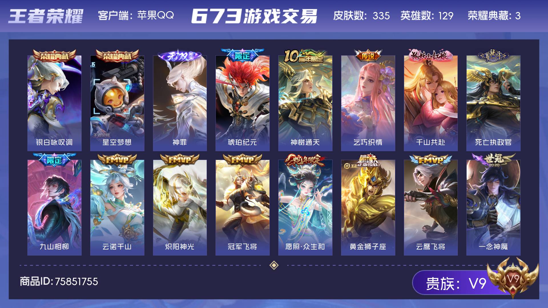 V9 皮肤335 英雄129 永恒钻石 荣耀典藏3 无双皮肤1 传说26 其他皮肤312