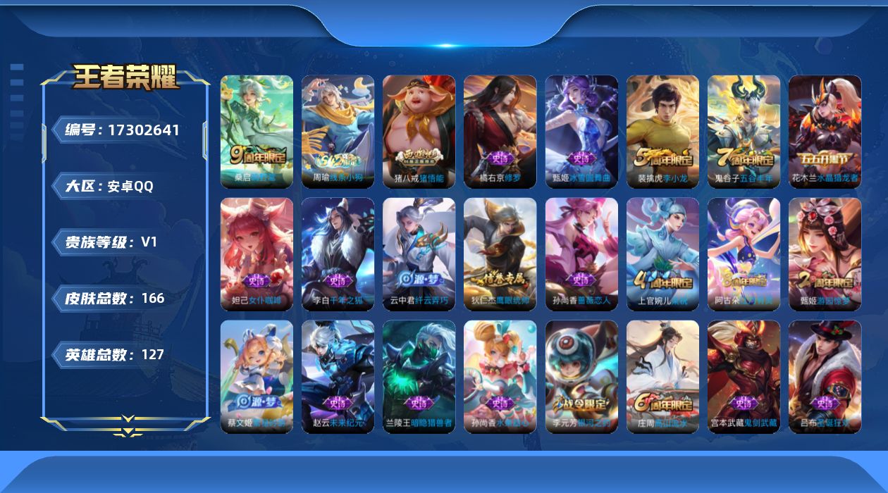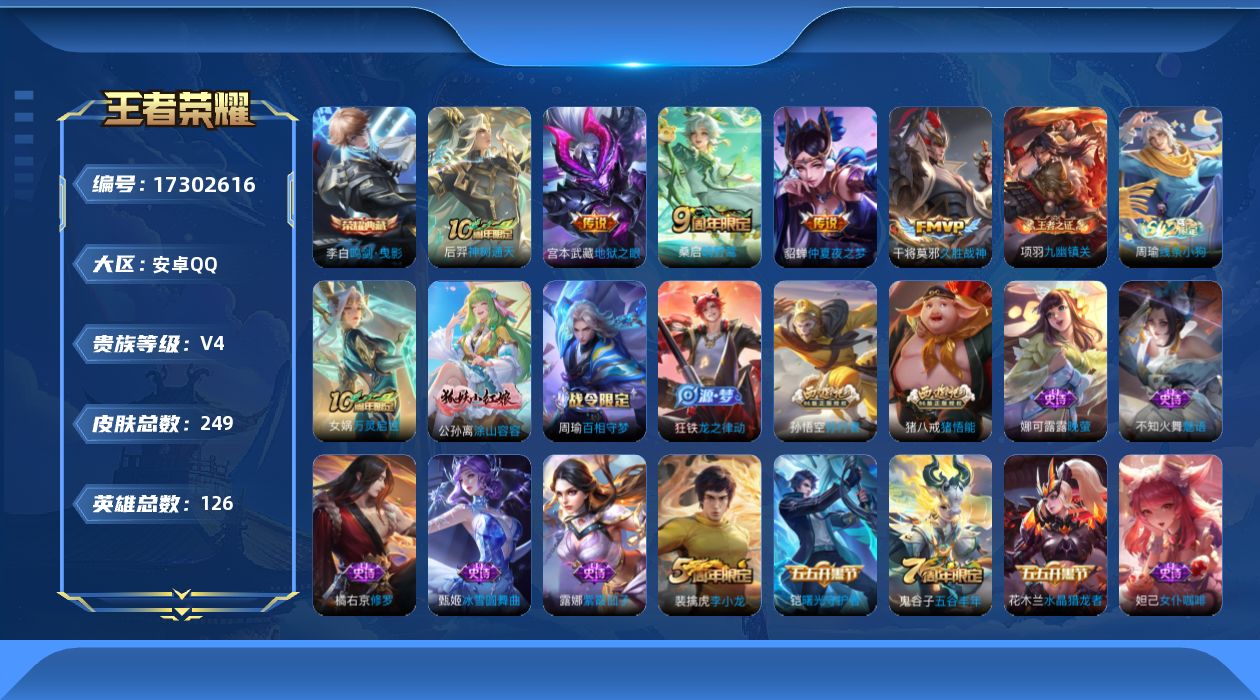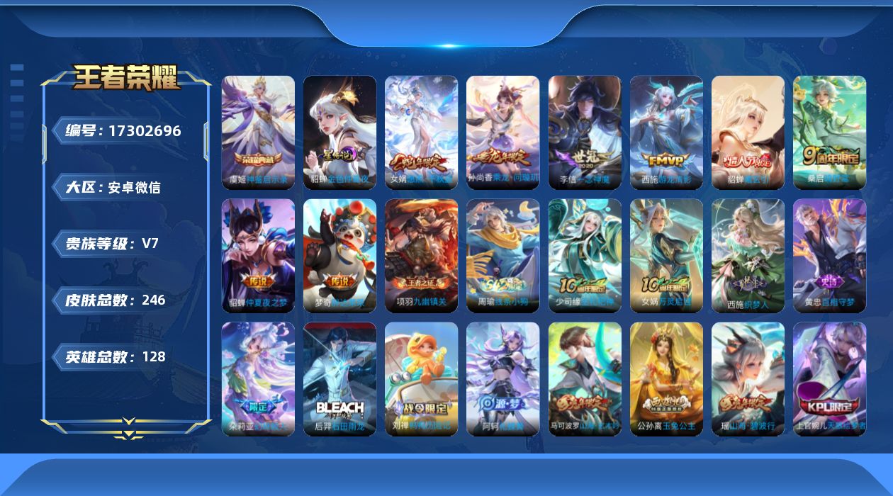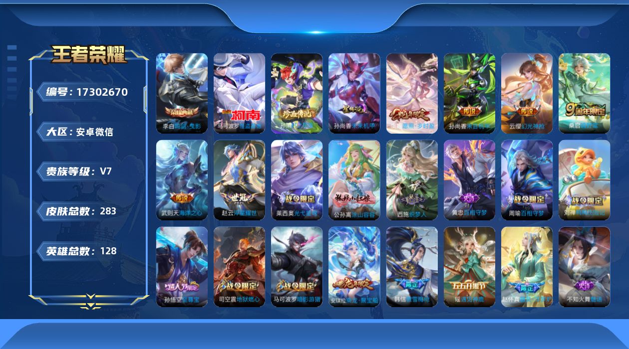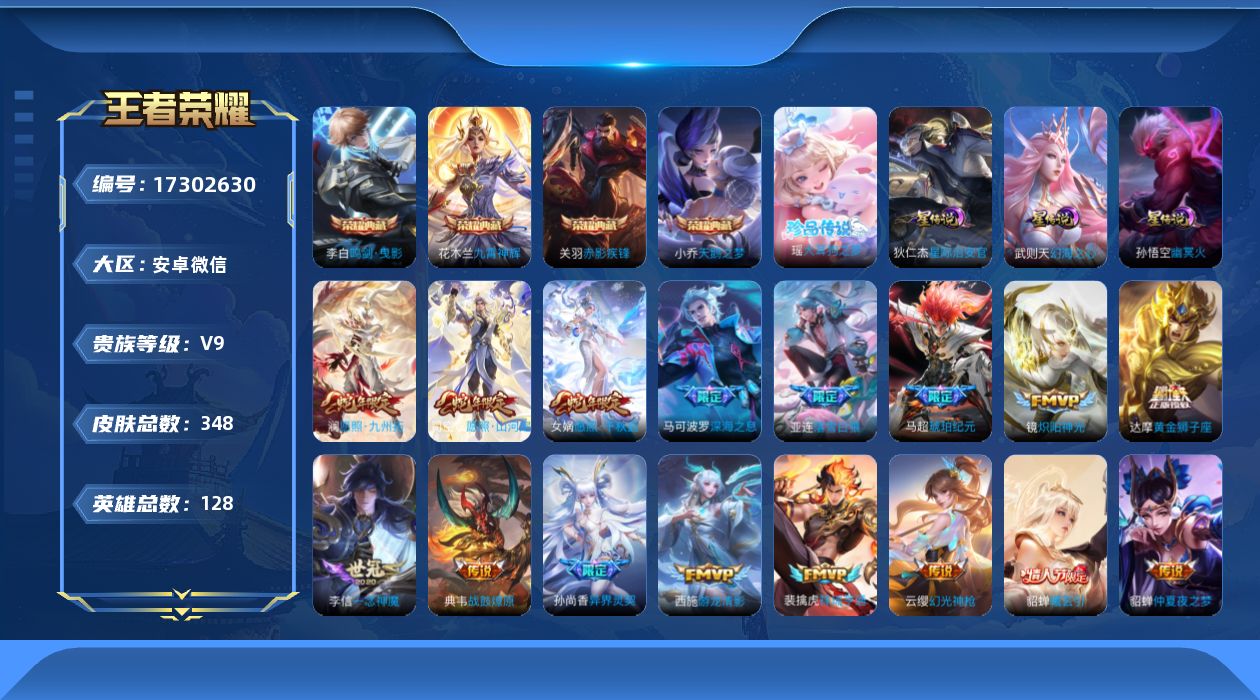 安卓WX-V9-最强王者段位-128英雄-347皮肤-4典藏
