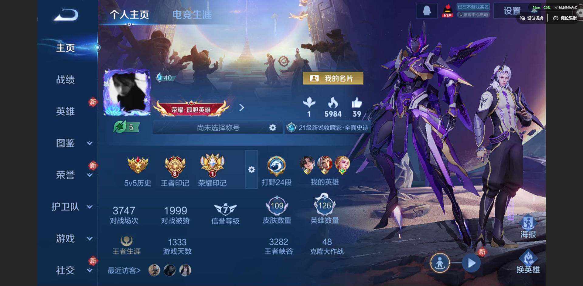 实名: 可修改 贵族等级: V4 英雄数: 126 皮肤数: 109 星传说: