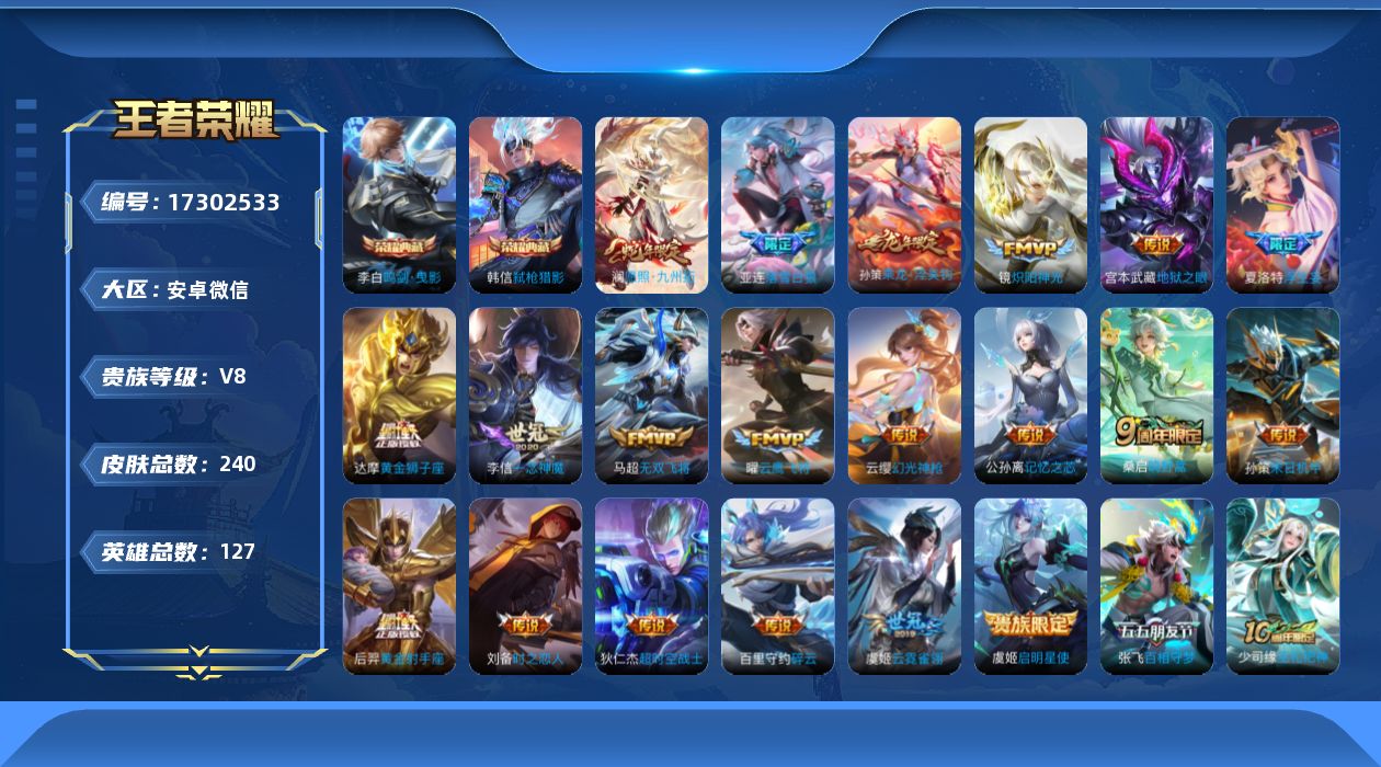 安卓WX-V8-最强王者段位-127英雄-238皮肤-2典藏