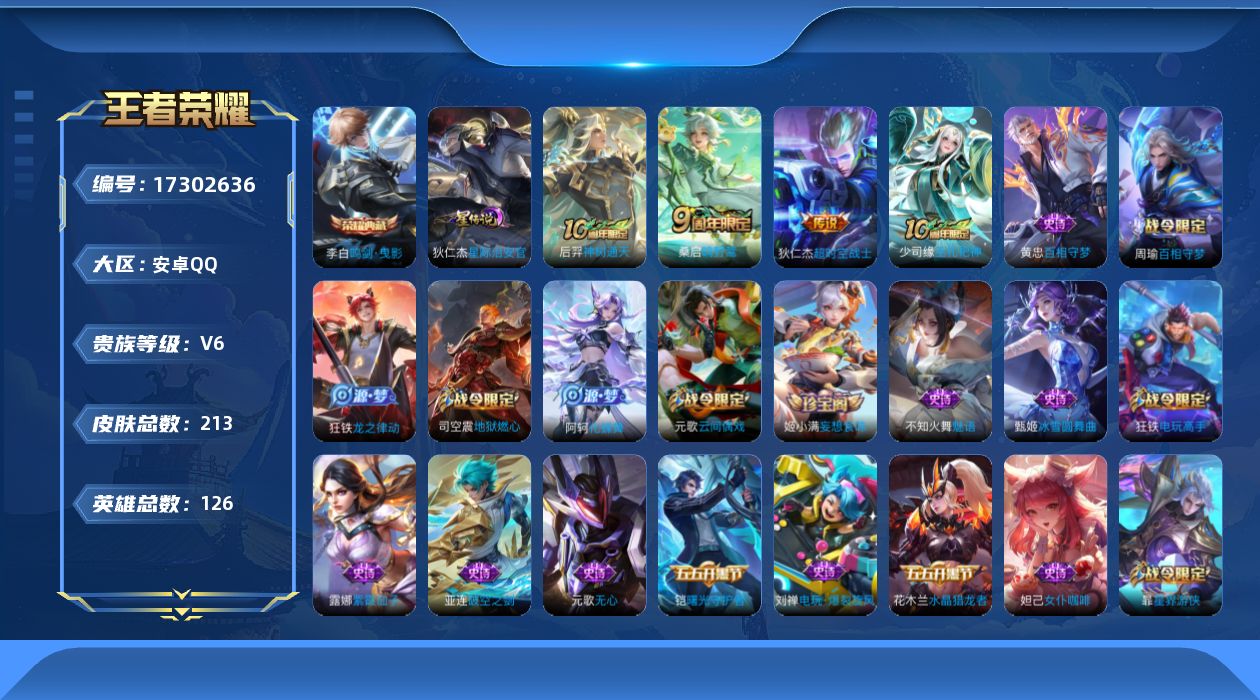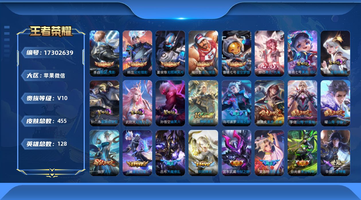 V10-最强王者段位-128英雄-450皮肤-5典藏皮肤-1典藏英雄-1无双-50传说-146史诗-5星传说