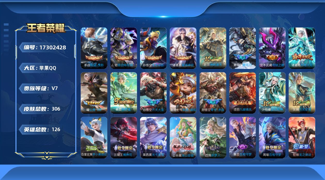 苹果Q-V7-最强王者段位-126英雄-305皮肤-4典藏皮