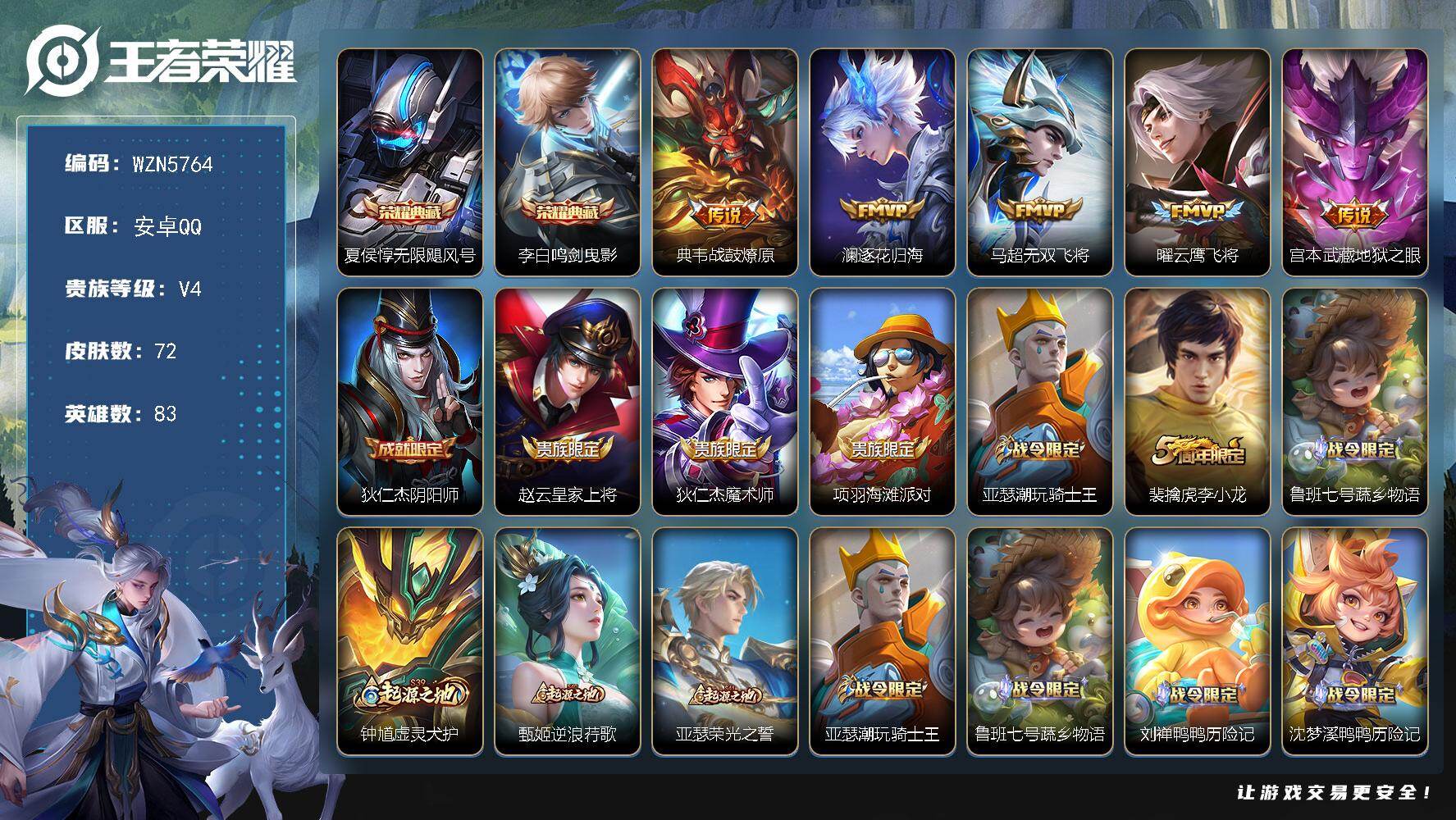贵族4/皮肤72/典藏2/传说5/史诗26/英雄83/夏侯惇-