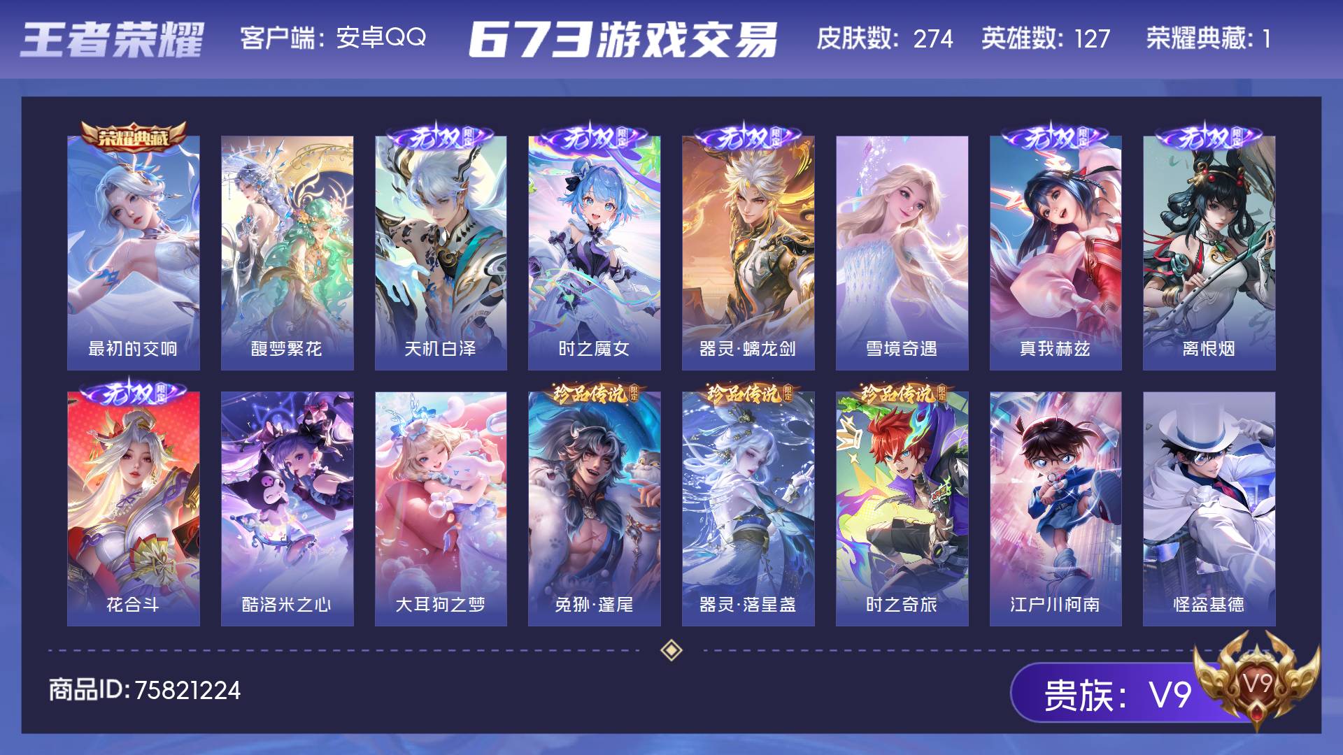 V9 皮肤274 英雄127 至圣王者 荣耀典藏1 珍品无双1 无双皮肤7 珍品传说7 传说34 其他皮肤231