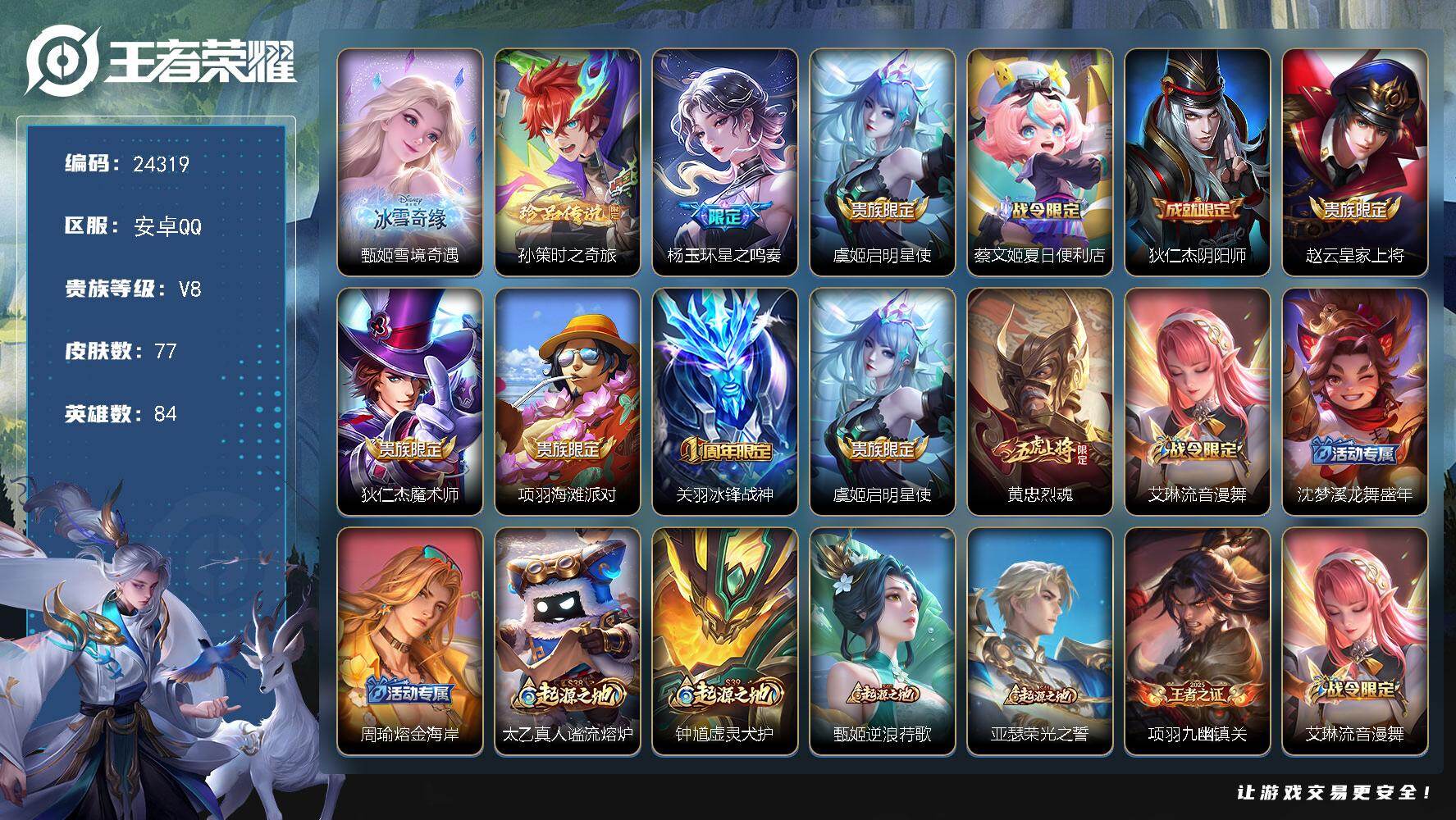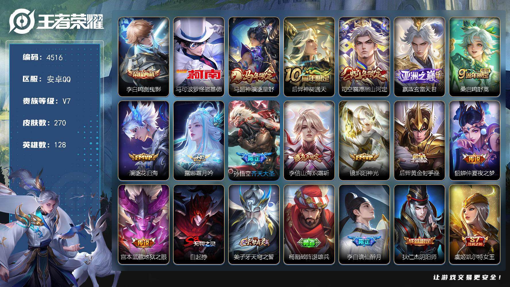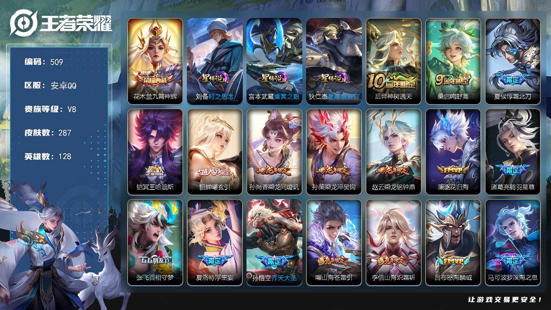 128英雄-299皮肤-安卓QQ/v8/永恒钻石/打野男号