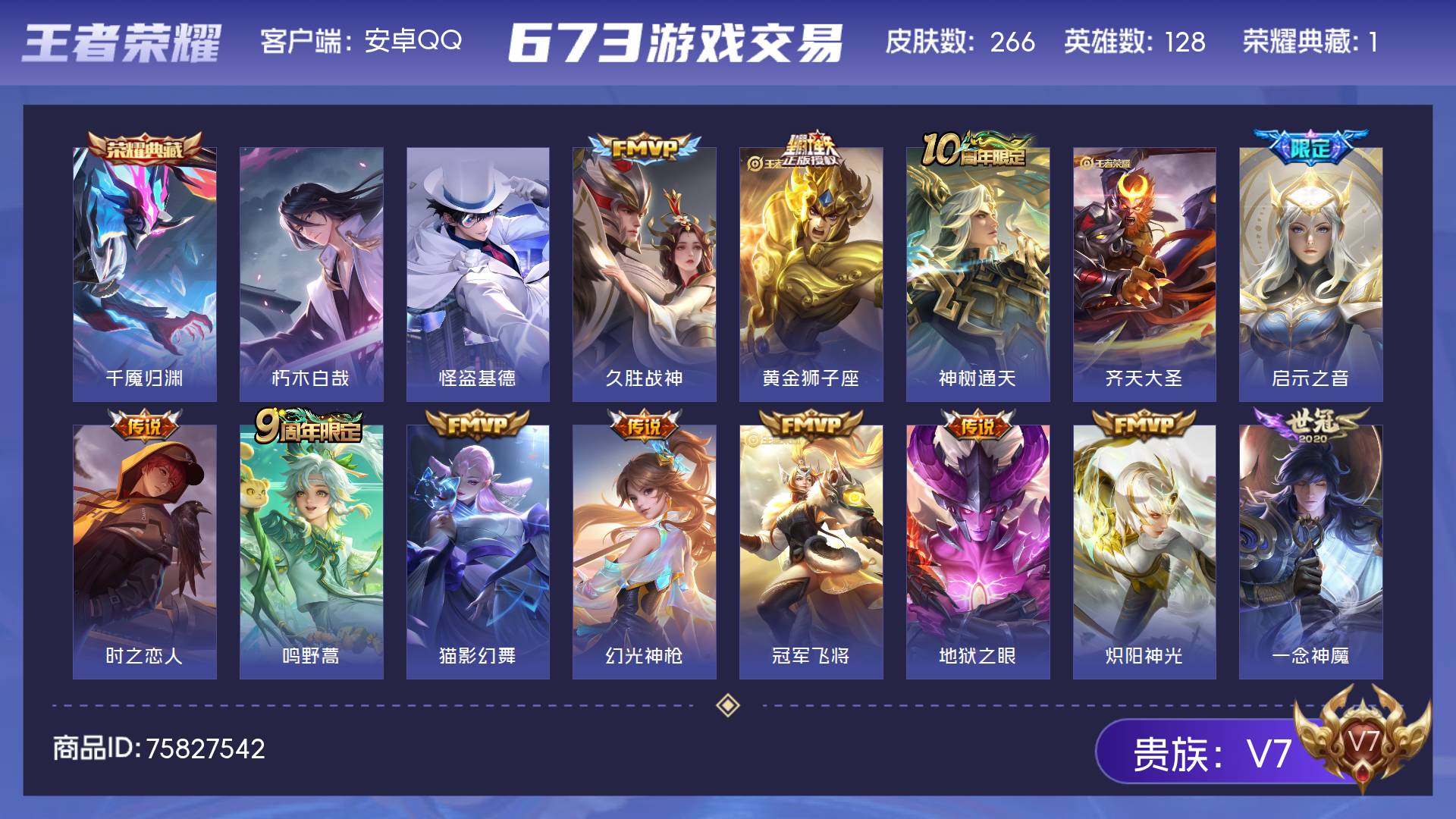 V7 皮肤266 英雄128 最强王者 荣耀典藏1 珍品传说2 传说20 其他皮肤250