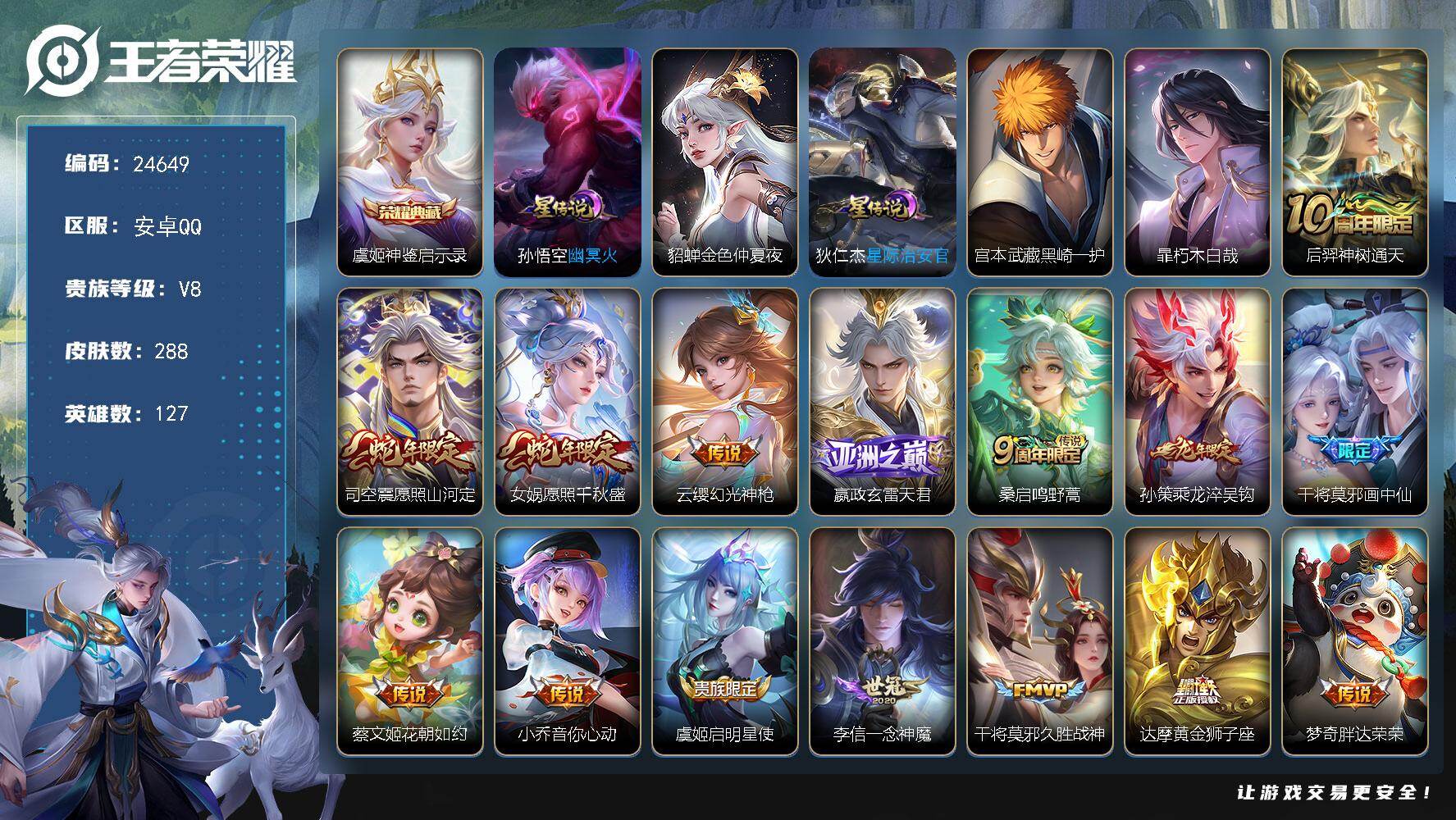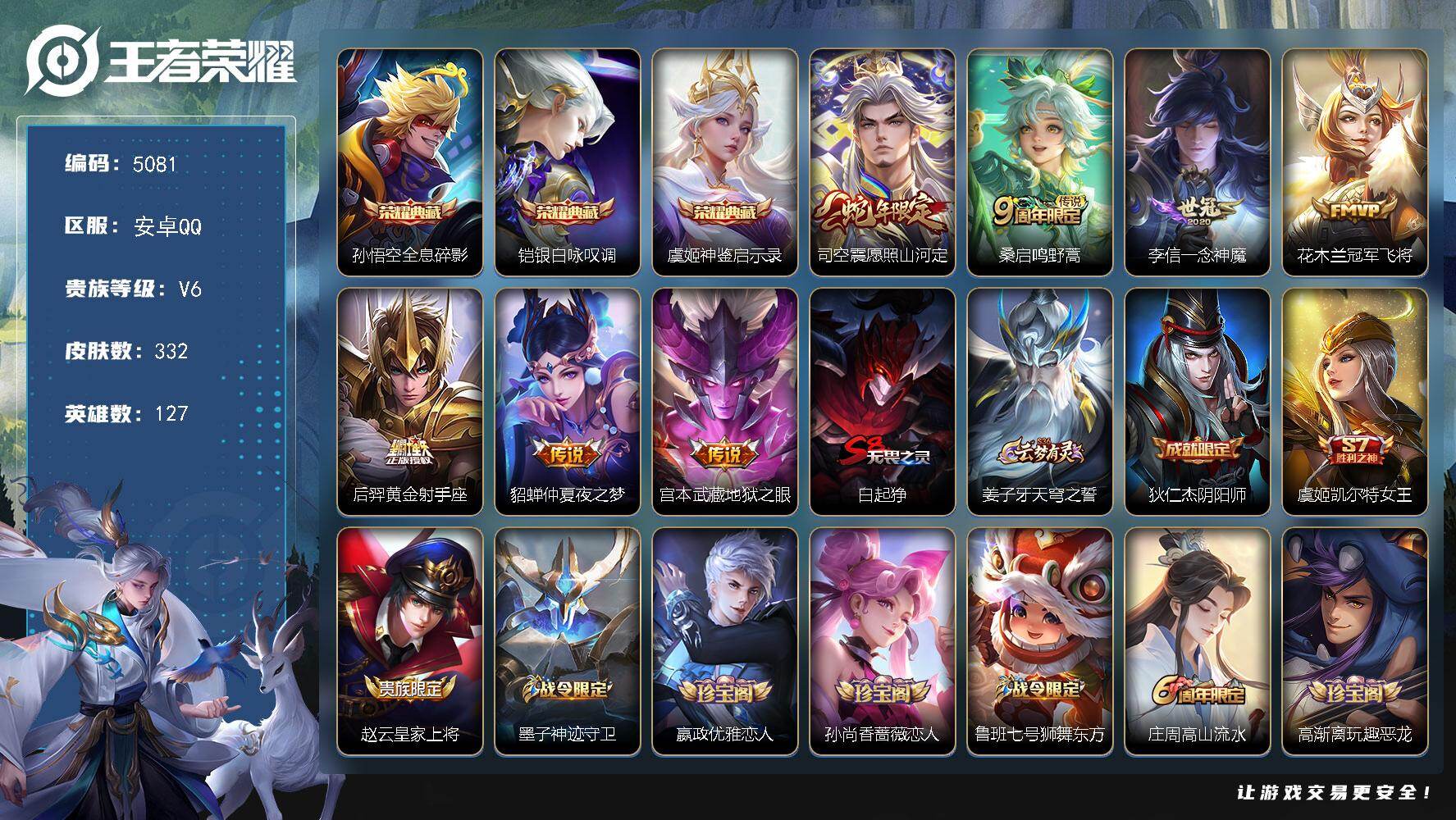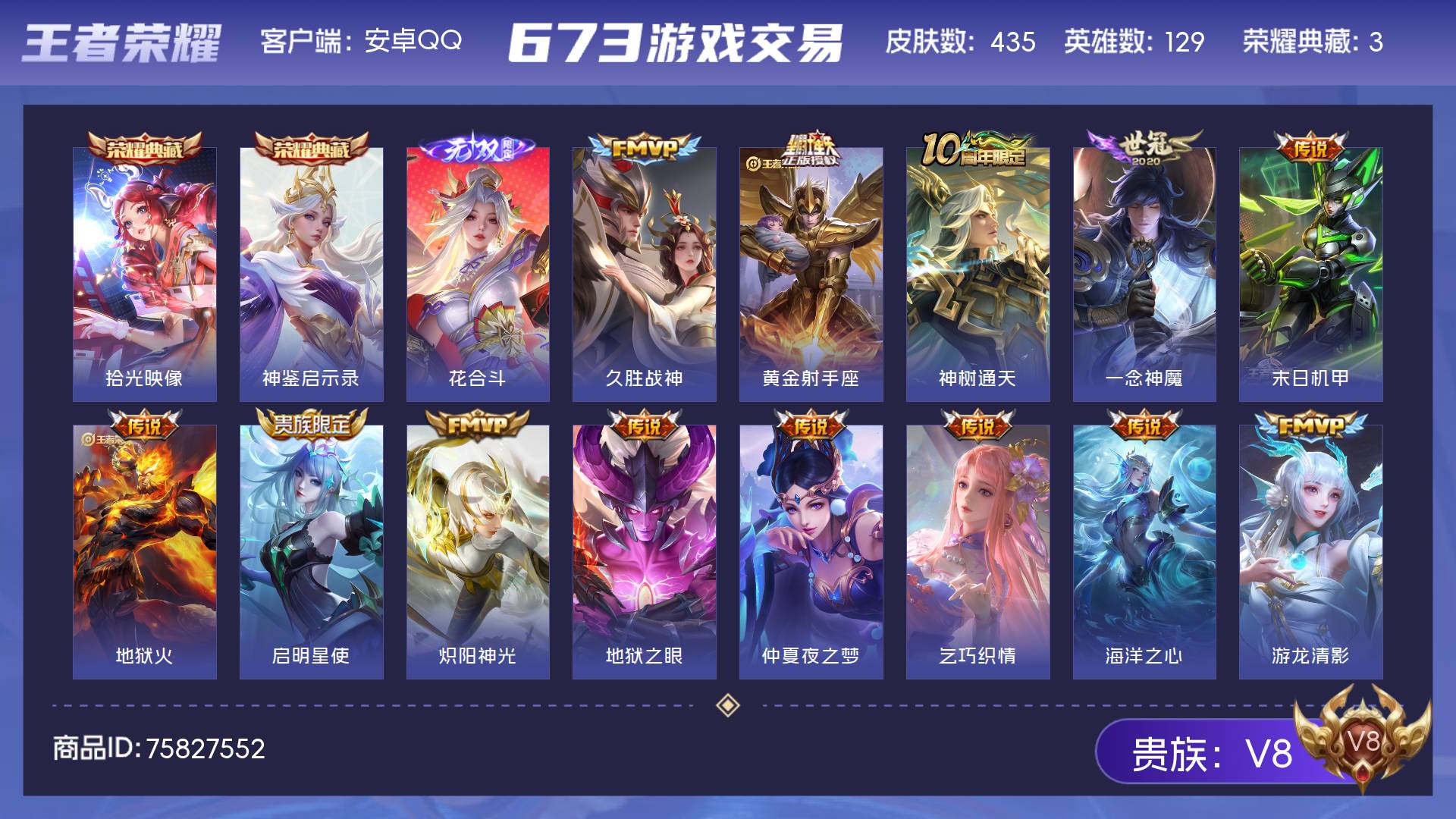 V8 皮肤435 英雄129 至尊星耀 荣耀典藏3 无双皮肤1 传说19 其他皮肤419