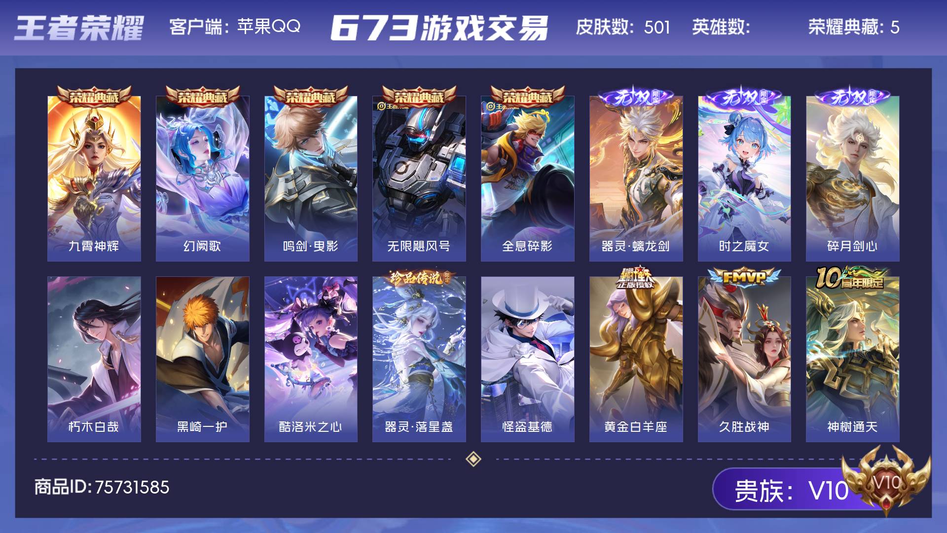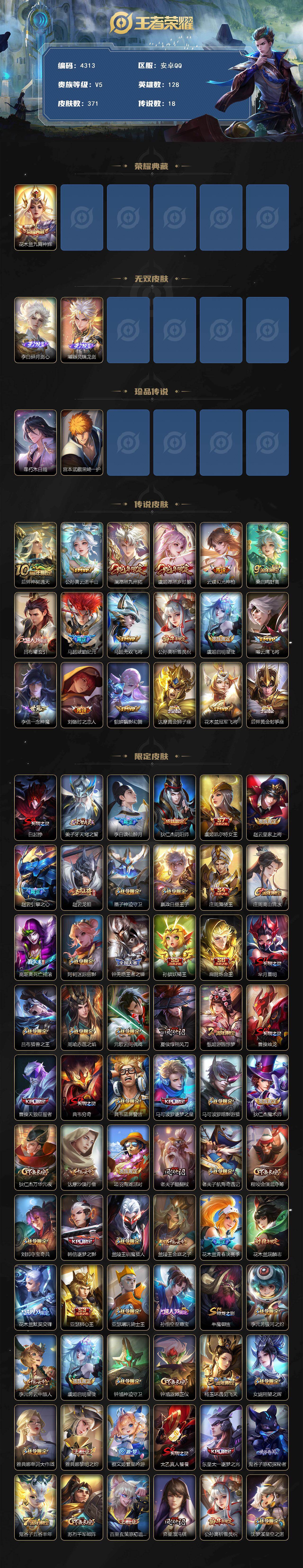 V10 皮肤501 至尊星耀 荣耀典藏5 无双皮肤3 珍品传说5 传说63 其他皮肤429
