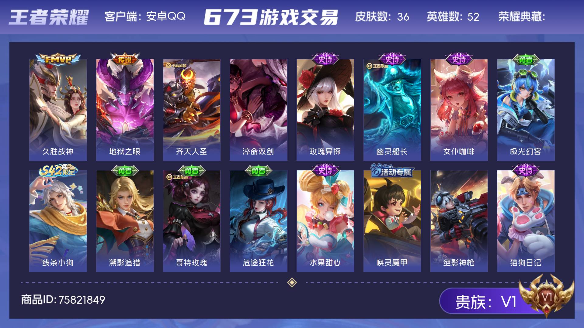V1 皮肤36 英雄52 尊贵铂金 传说3 其他皮肤38