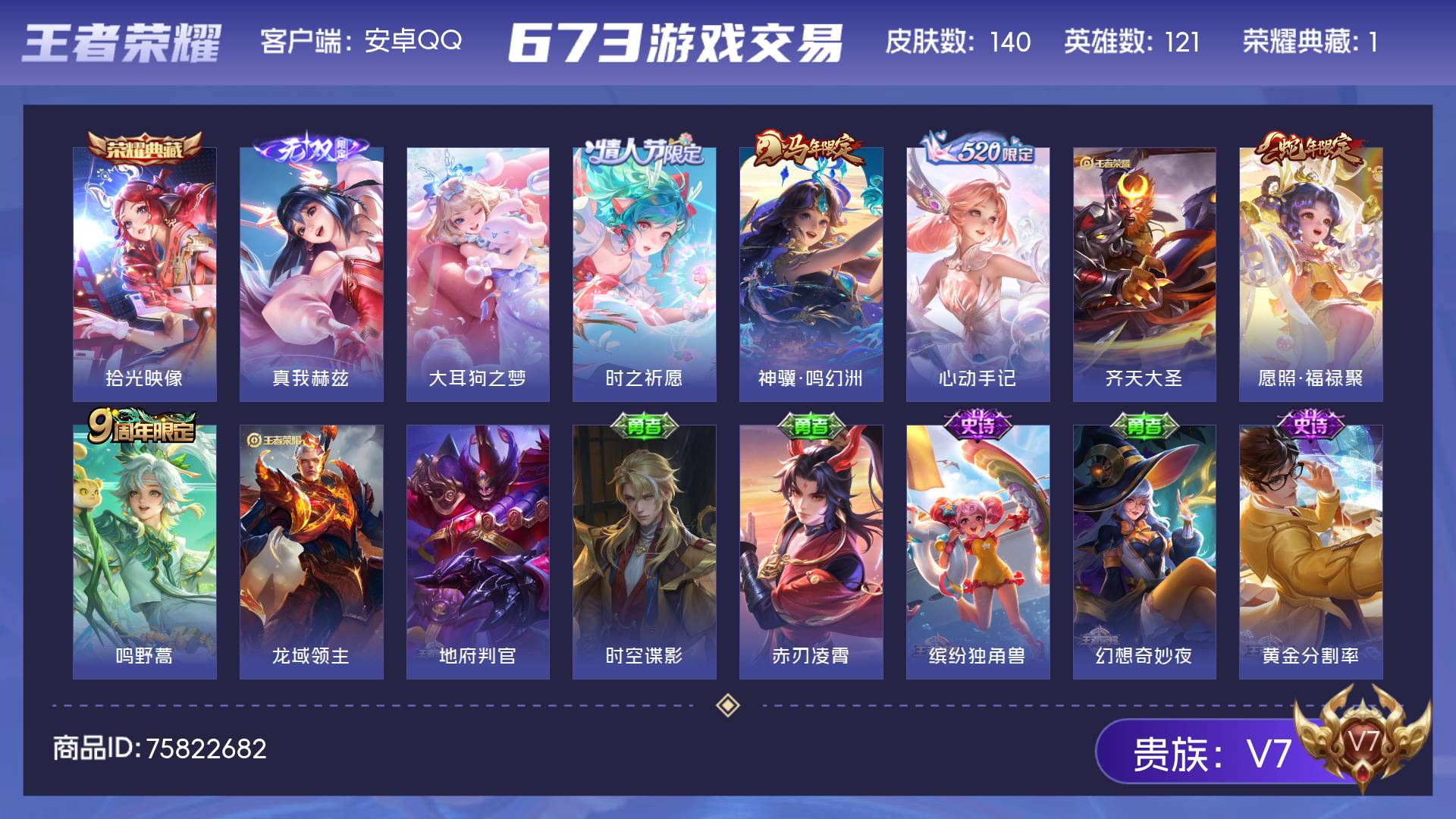 V7 皮肤140 英雄121 至尊星耀 荣耀典藏1 无双皮肤1 珍品传说1 星传说1 传说6 其他皮肤137