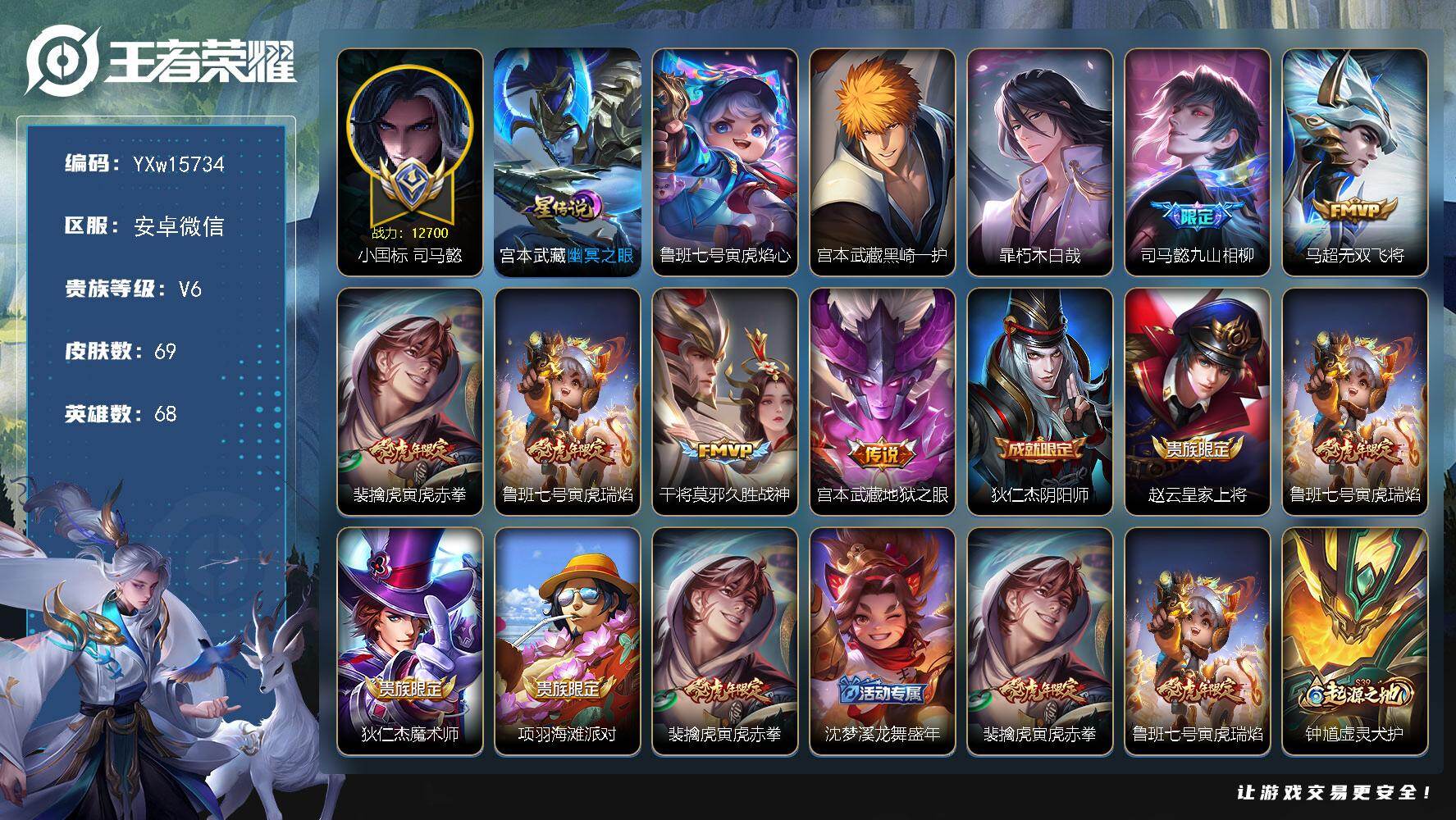 68英雄-69皮肤-4王者印记-150铭文-贵族积分1w