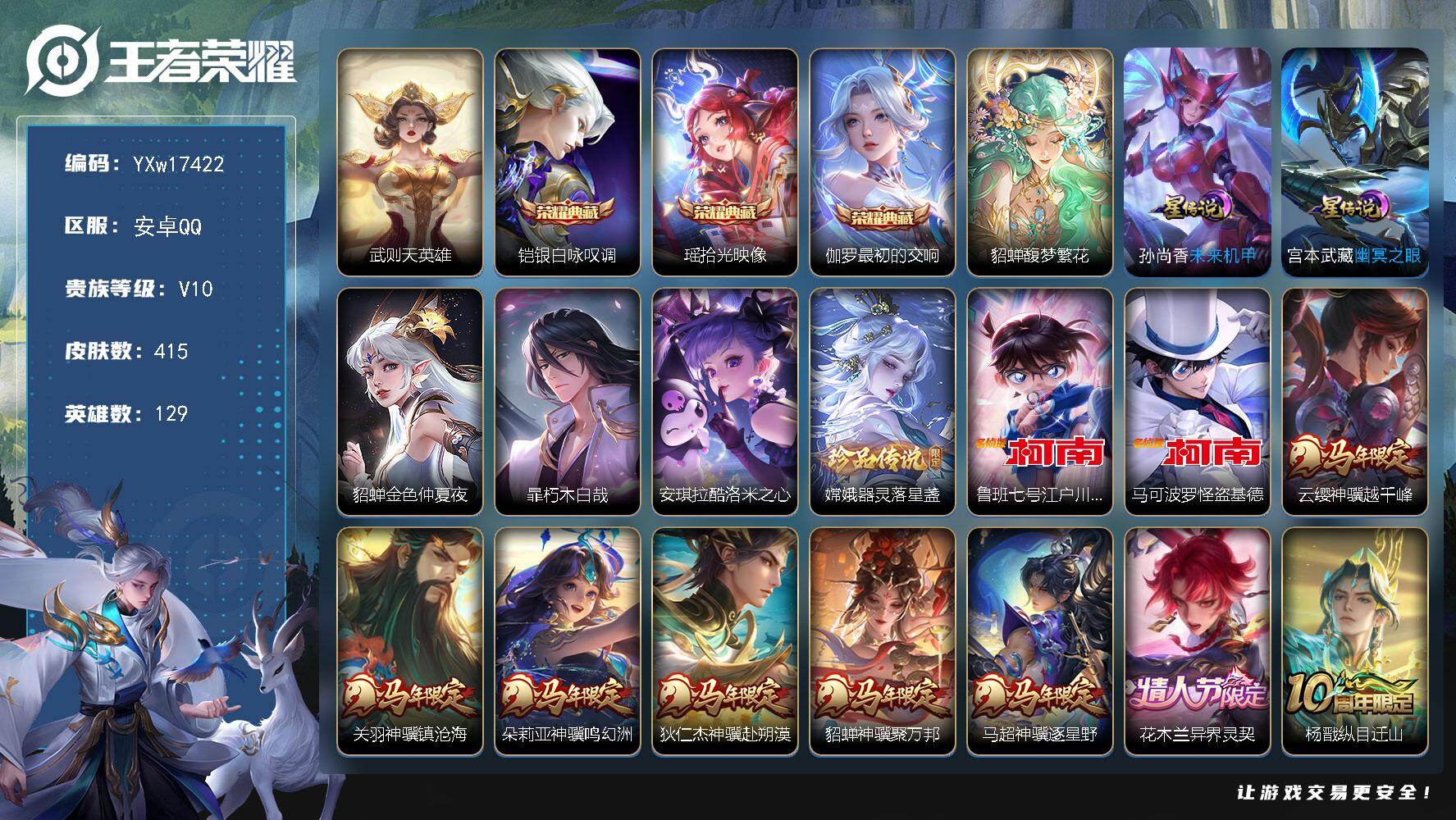 129英雄-415皮肤-6王者印记-200铭文-贵族积分20w