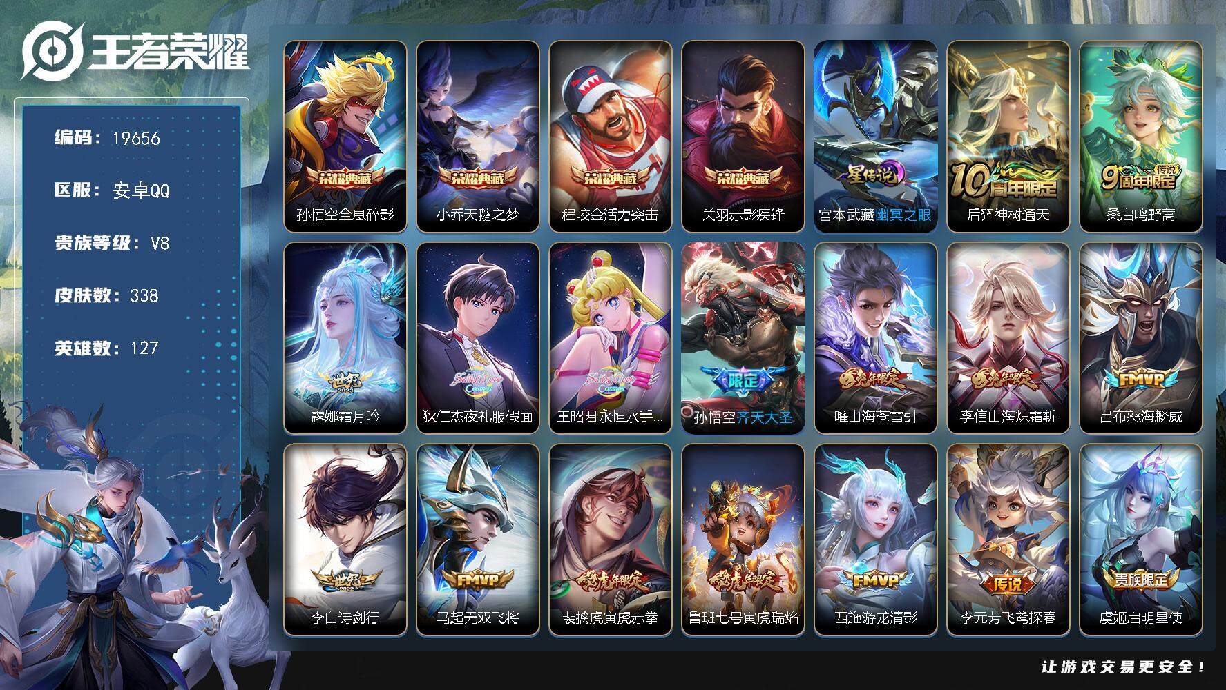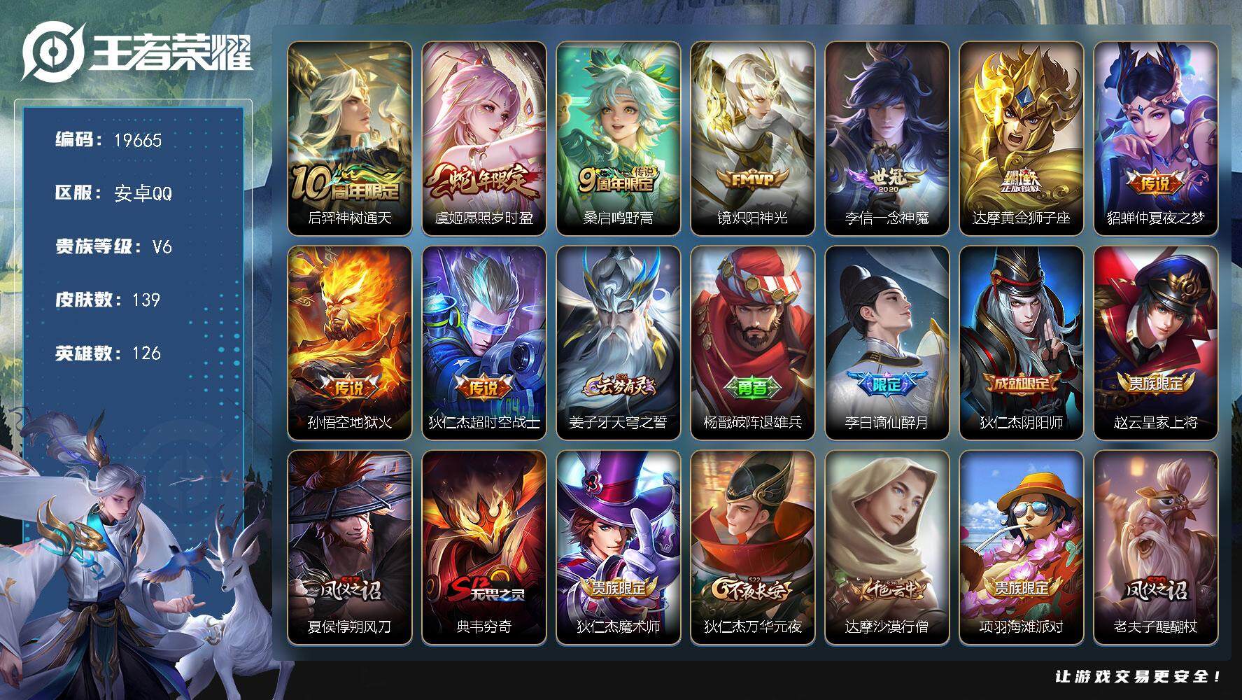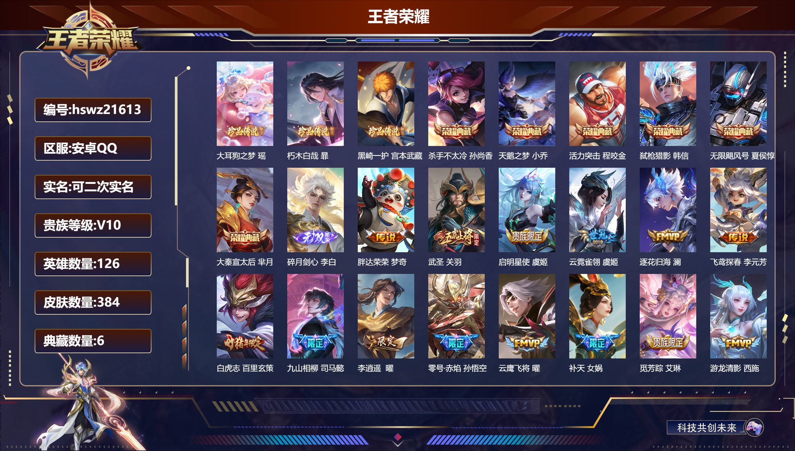 安卓QQ/荣耀王者/384皮肤/126英雄/6典藏/0珍品无双/1无双/3珍品传说/33传说/112