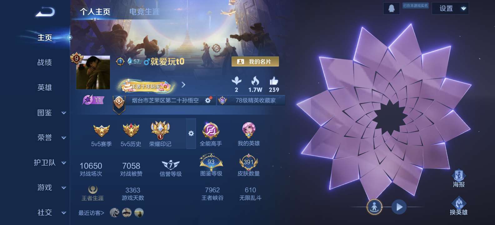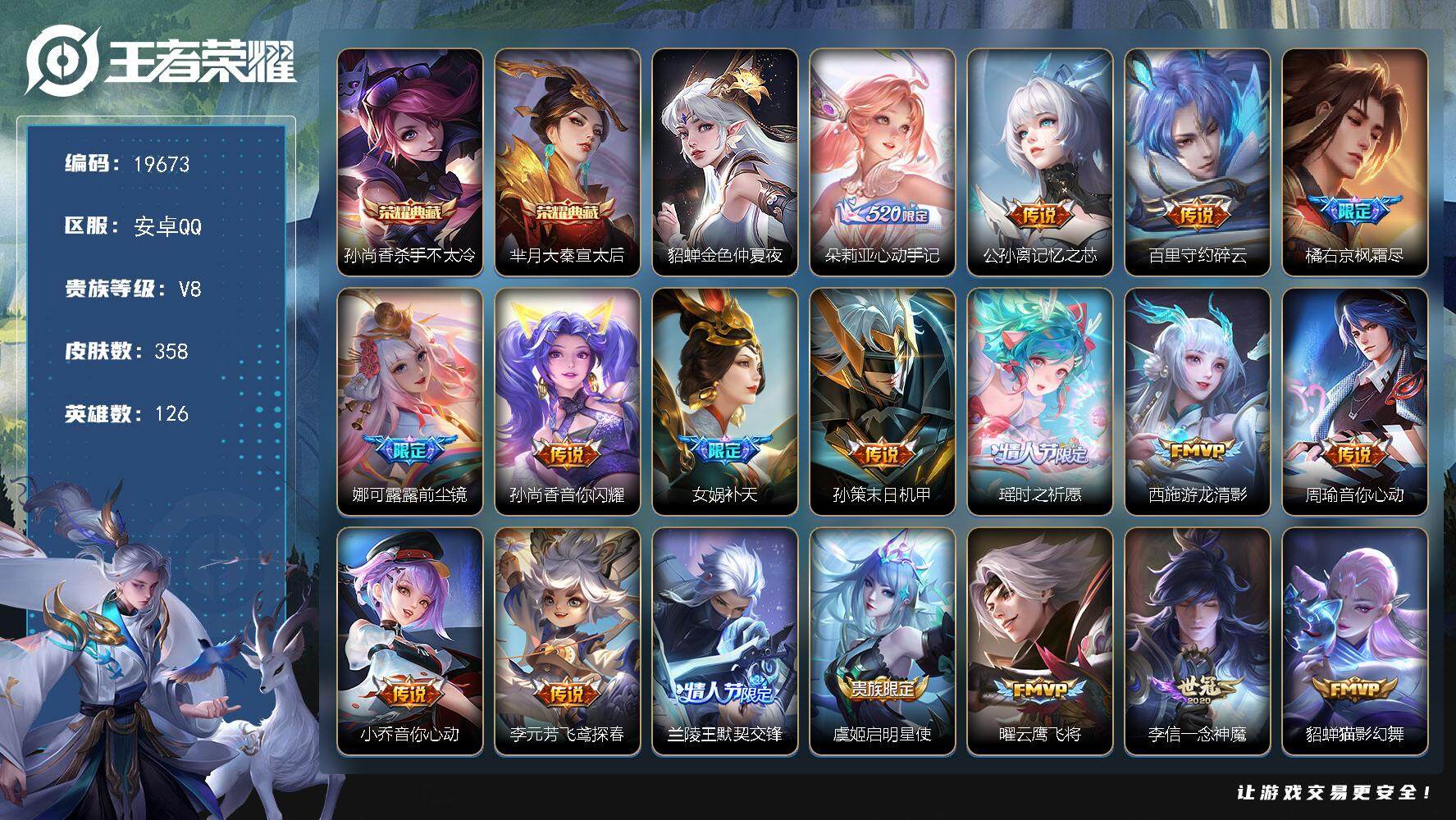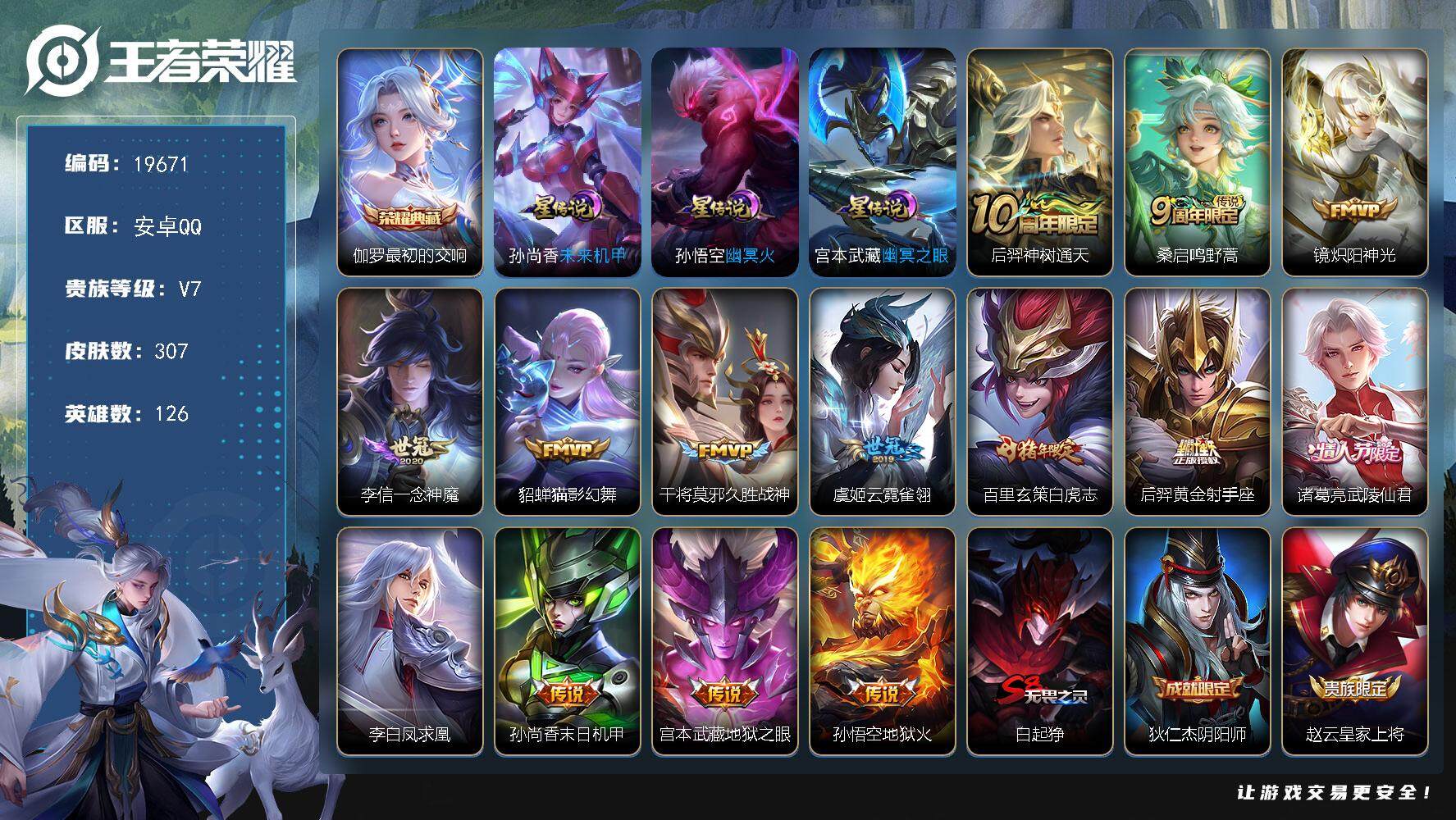 安卓QQ/荣耀王者/384皮肤/126英雄/6典藏/0珍品无双/1无双/3珍品传说/33传说/112