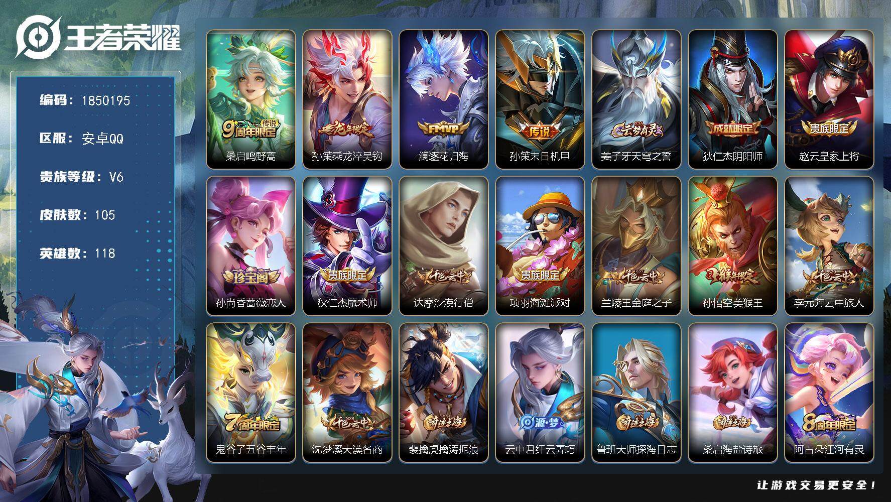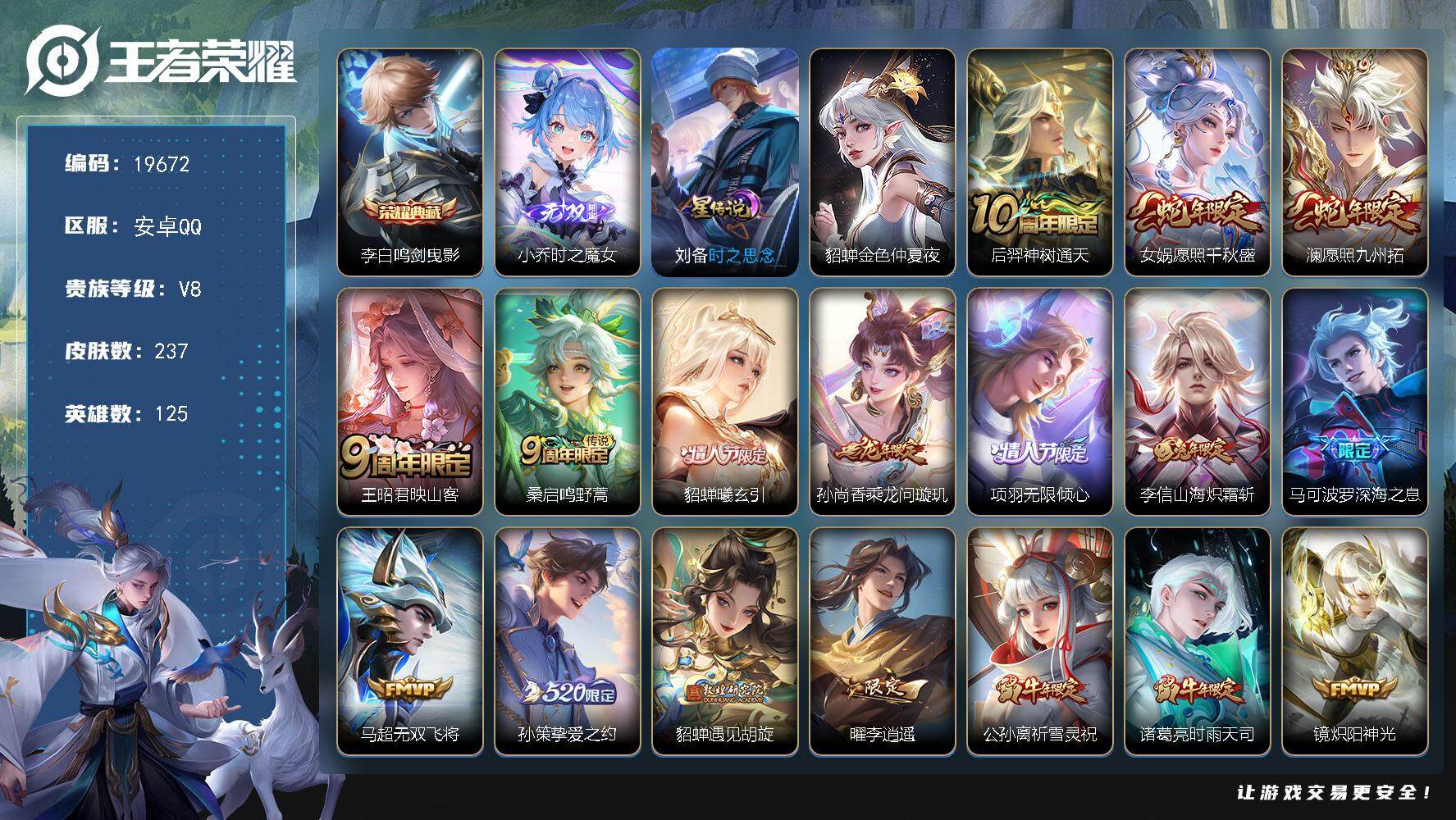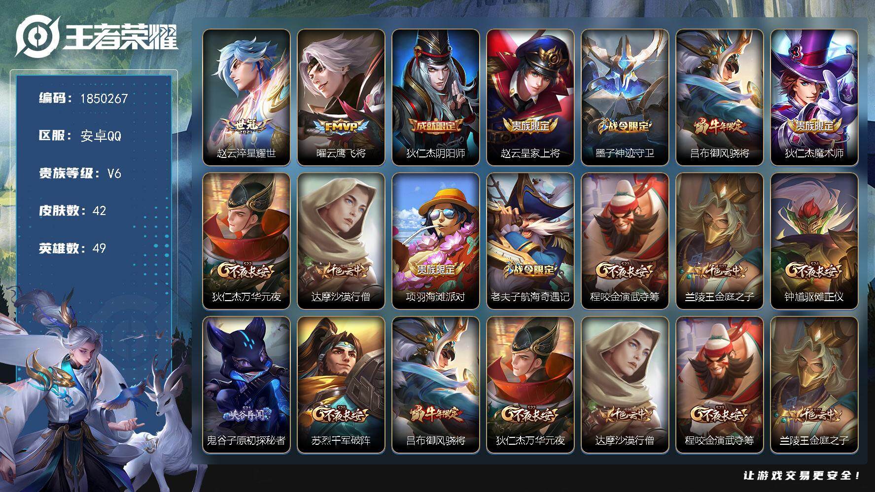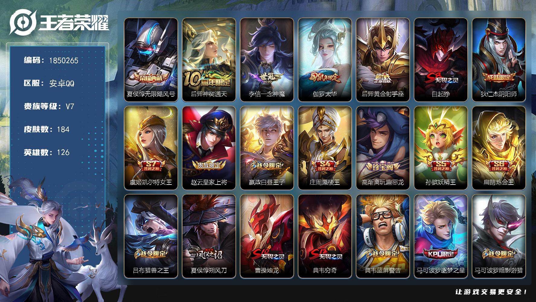 安卓QQ/无双王者/203皮肤/127英雄/1典藏/0珍品无双/0无双/3珍品传说/14传说/54史