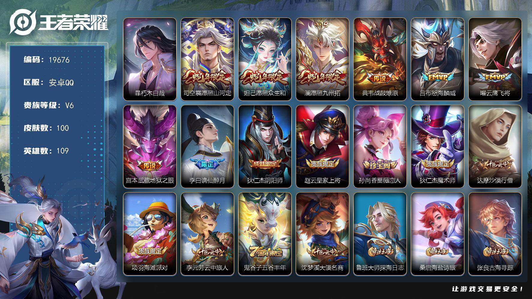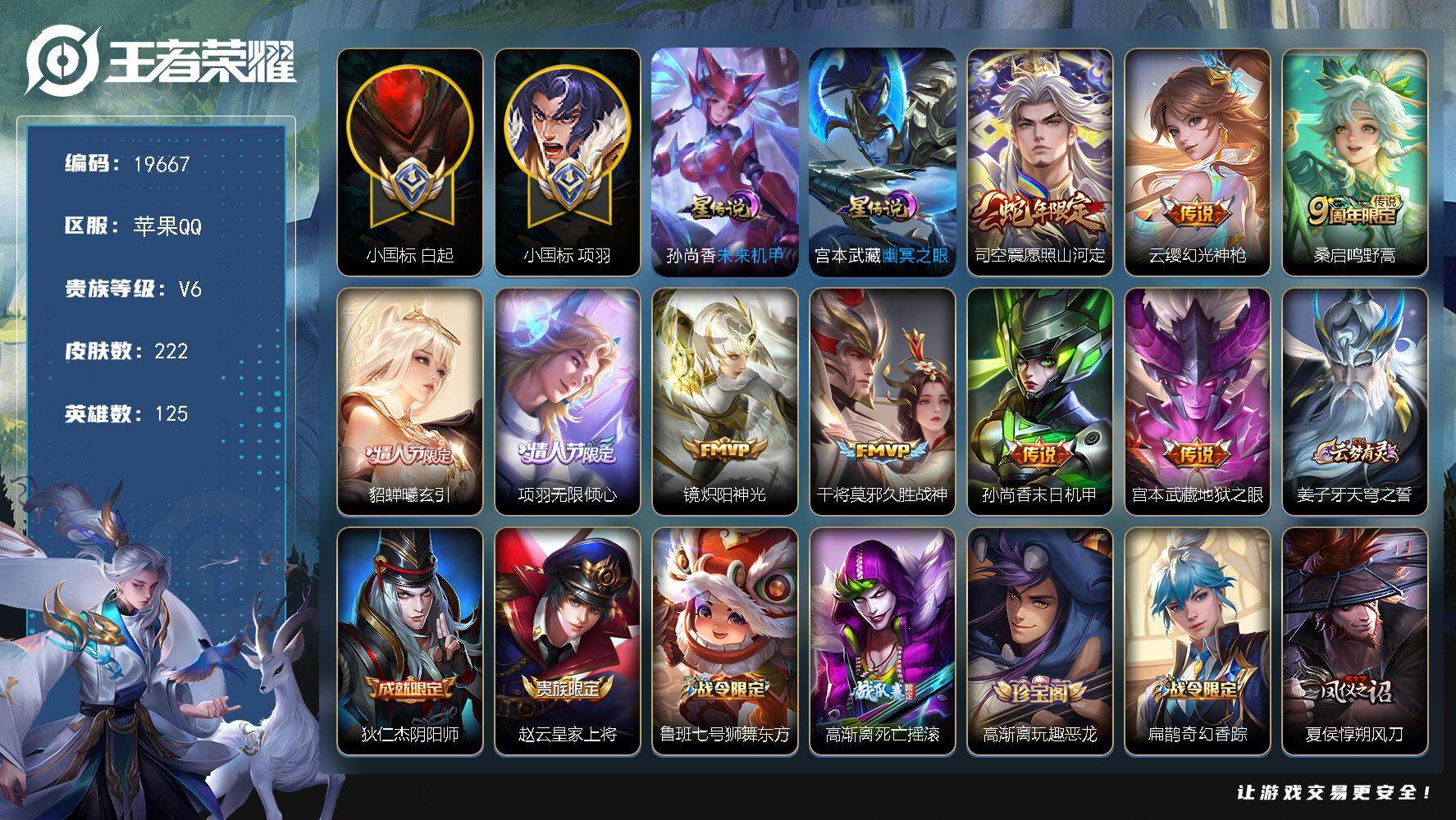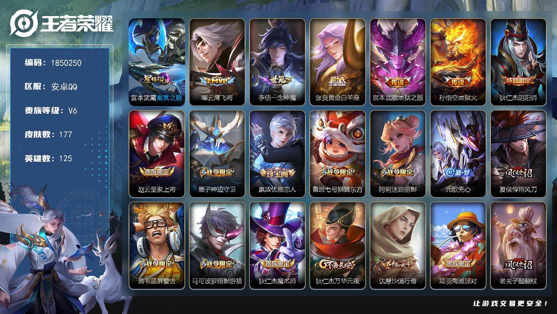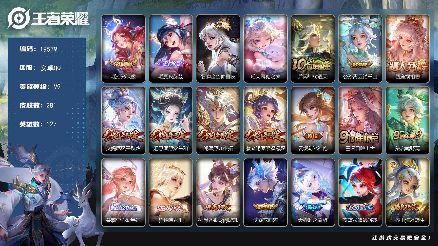 安卓QQ/无双王者/203皮肤/127英雄/1典藏/0珍品无双/0无双/3珍品传说/14传说/54史