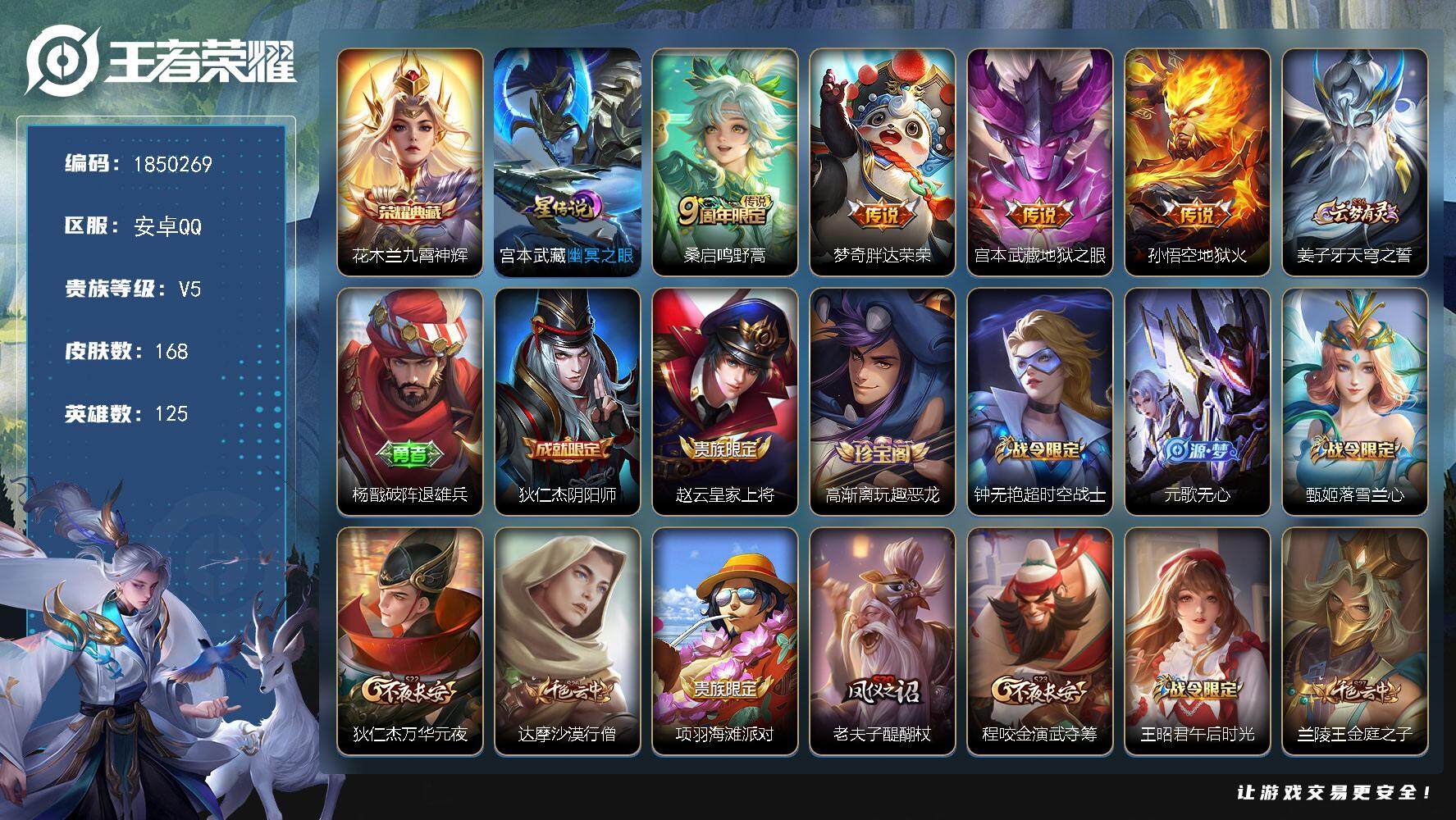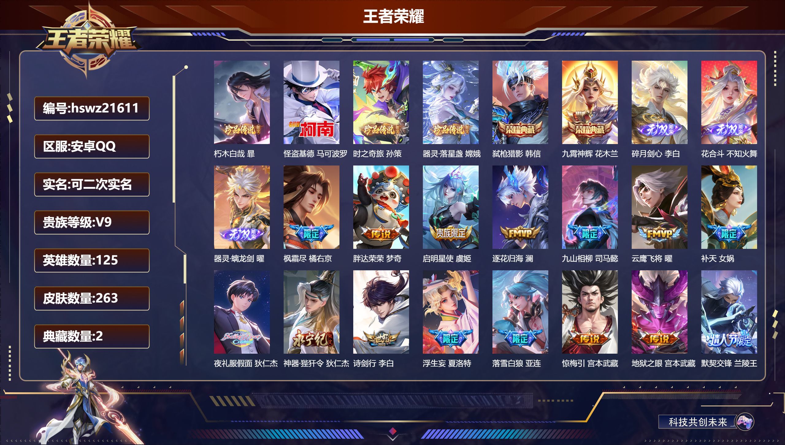 安卓QQ/最强王者/263皮肤/125英雄/2典藏/0珍品无双/3无双/4珍品传说/45传说/97史
