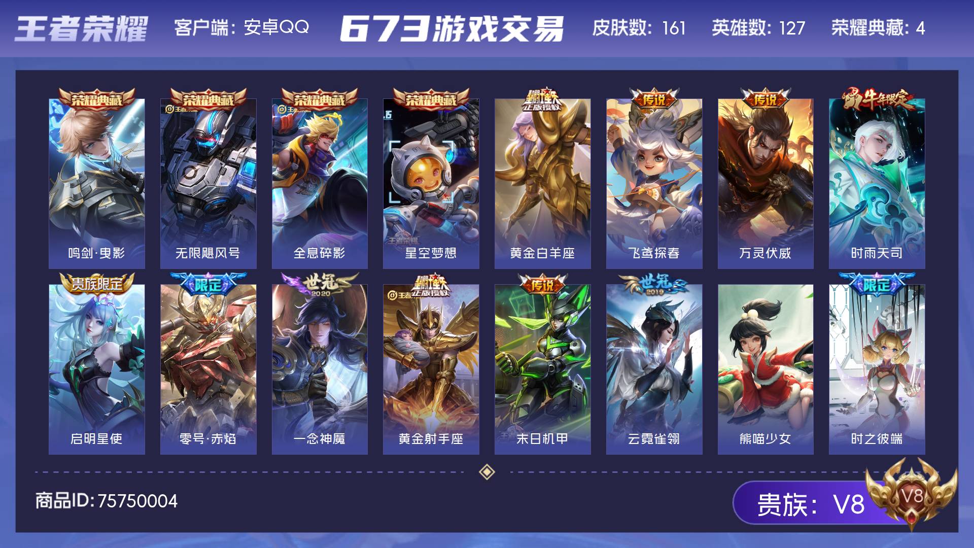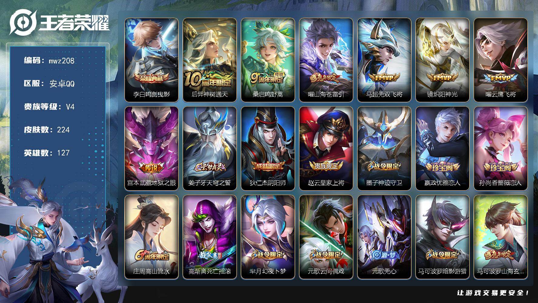 【mwz208】安卓Q-V4-永恒钻石III段位-127英雄-224皮肤-1典