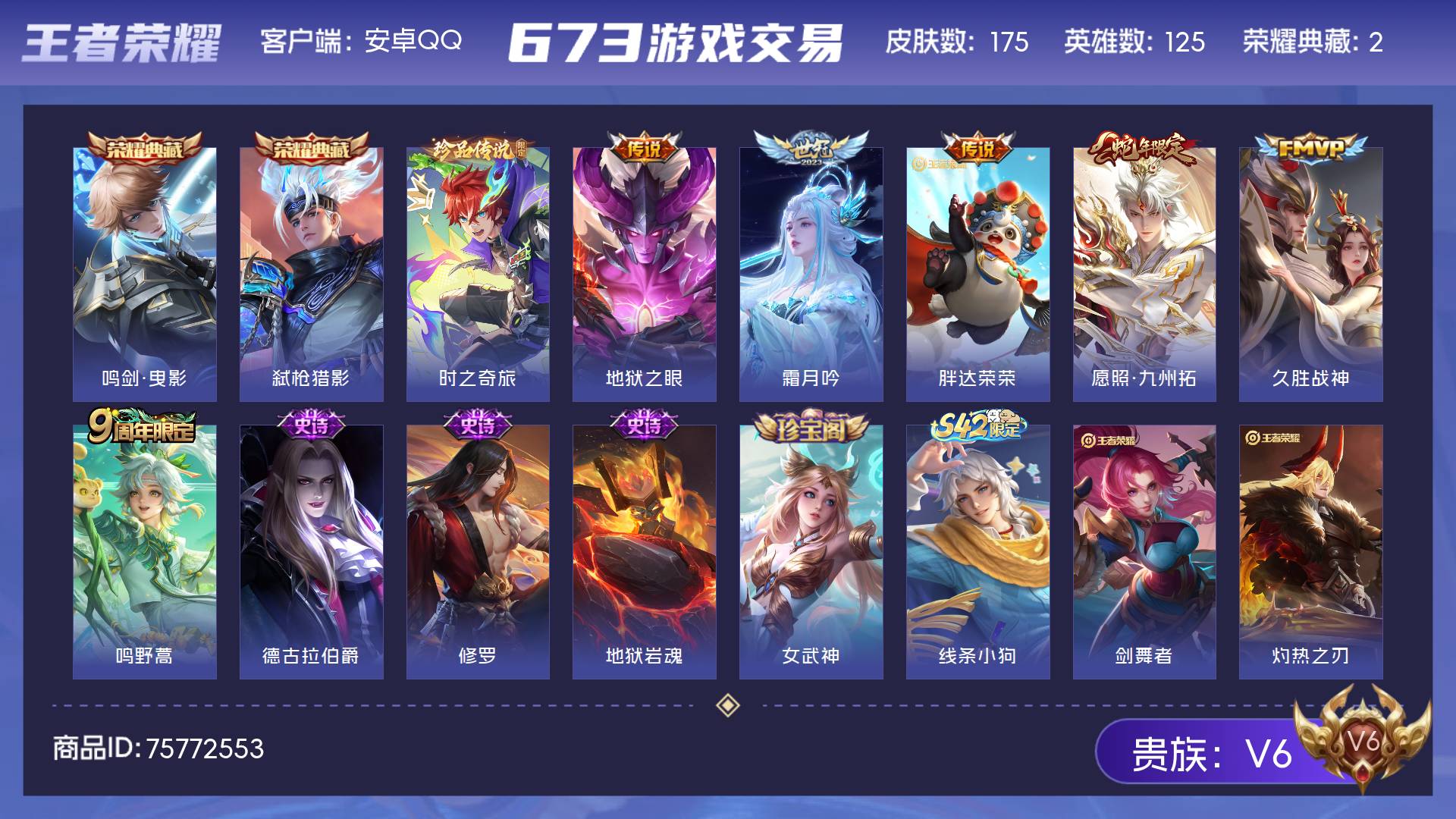 V6 皮肤175 英雄125 永恒钻石 荣耀典藏2 珍品传说1 传说6 其他皮肤172
