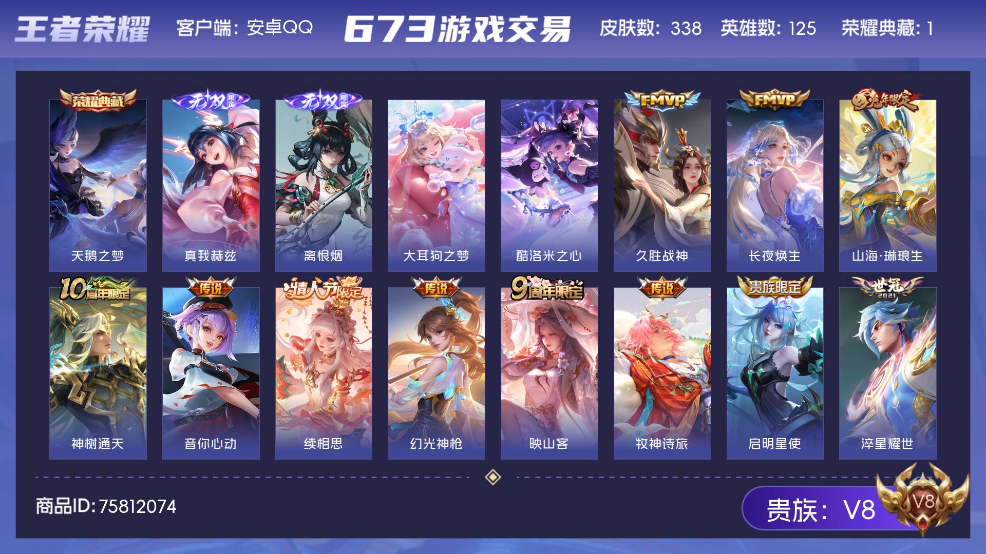 V8 皮肤338 英雄125 至圣王者 荣耀典藏1 无双皮肤2 珍品传说2 星传说2 传说23 其他