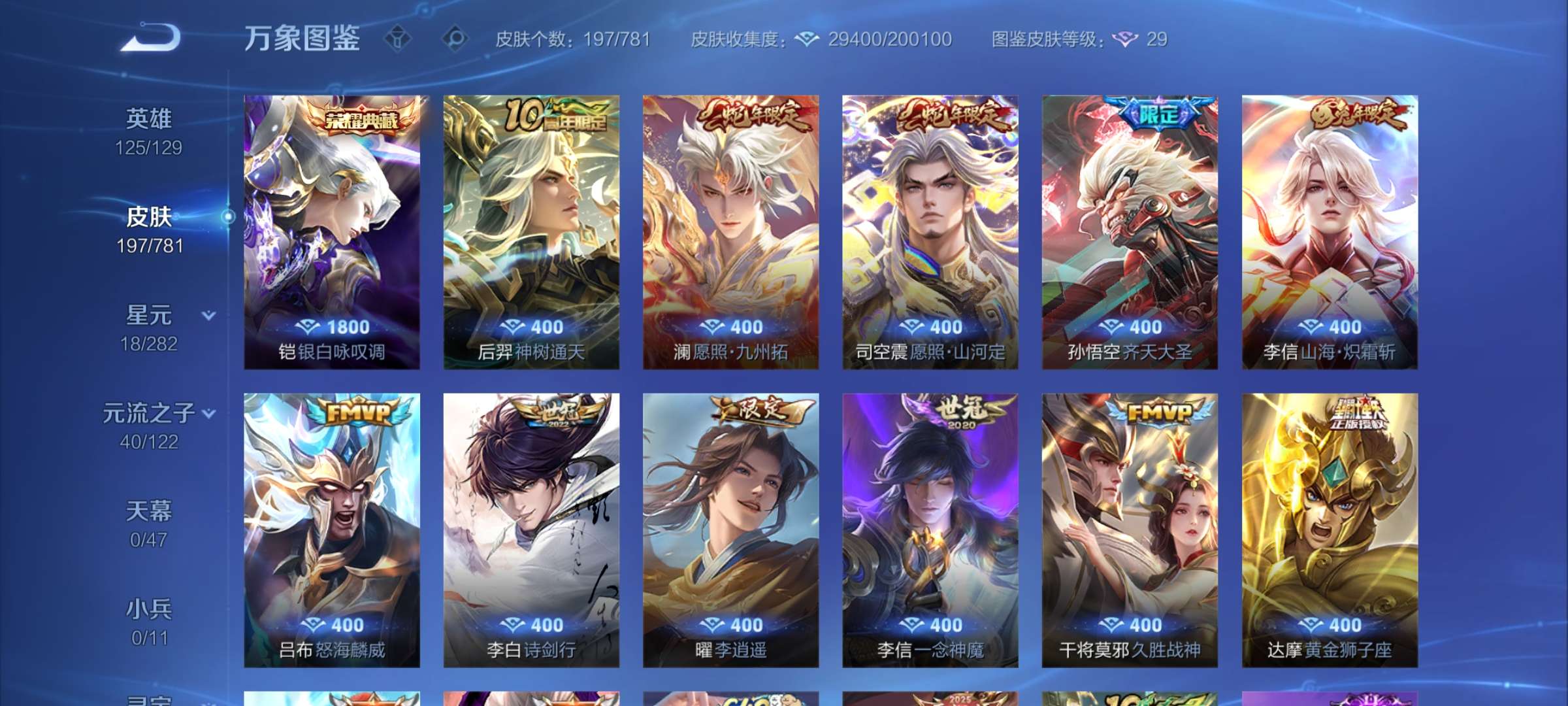 最强王者段位-128英雄-252皮肤-1典藏皮肤-2珍品传说-24传说-79史诗