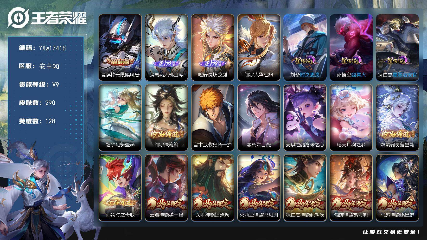 128英雄-290皮肤-7王者印记-300铭文-贵族积分10w