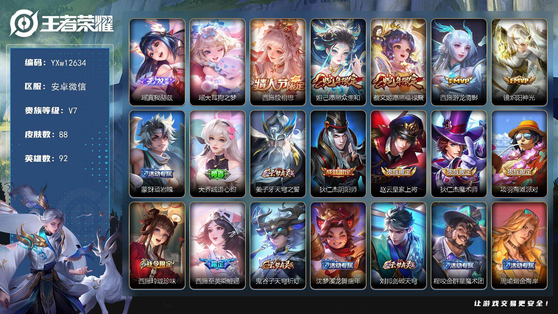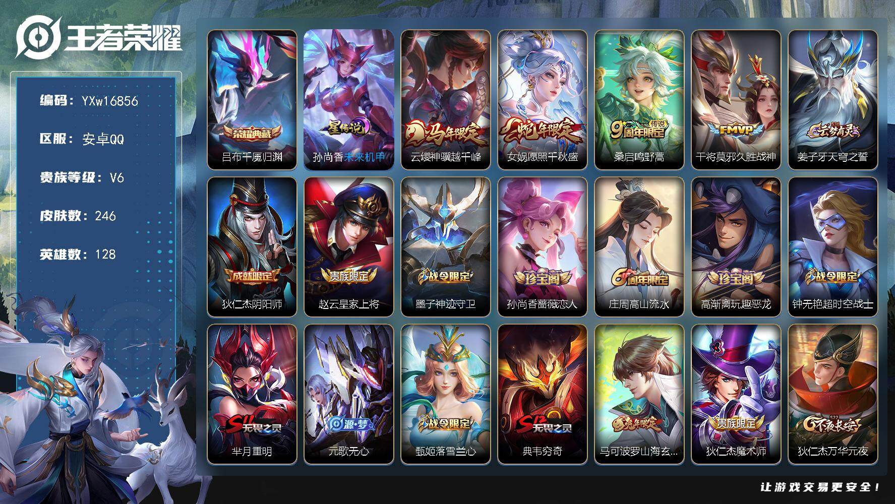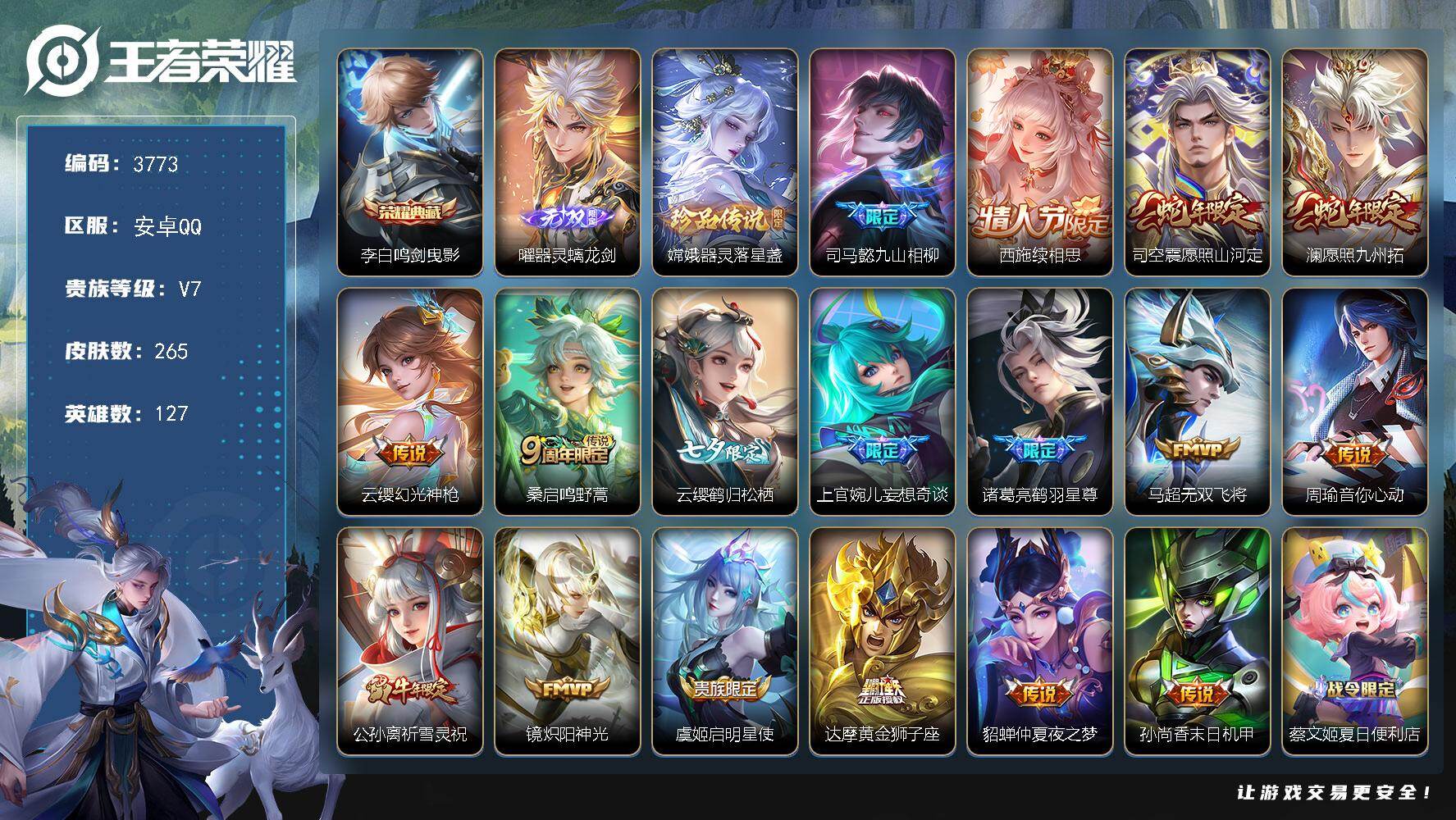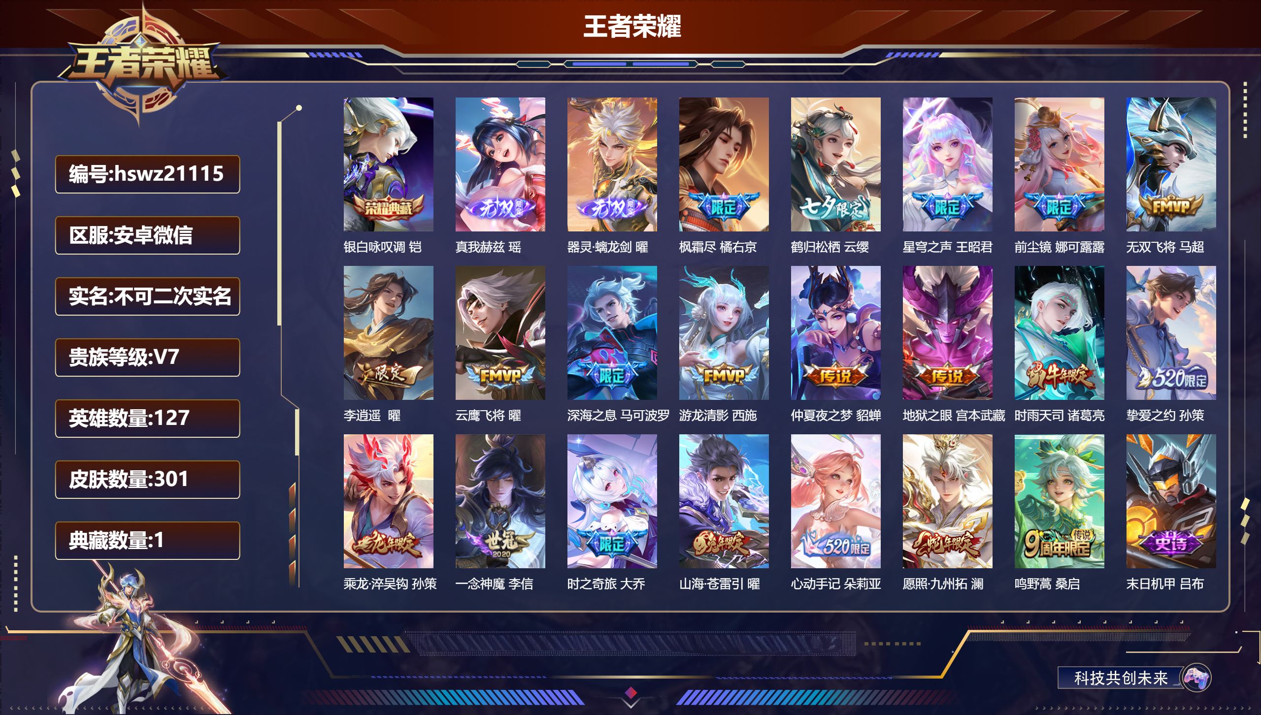 安卓微信/最强王者/301皮肤/127英雄/1典藏/0珍品无双/2无双/0珍品传