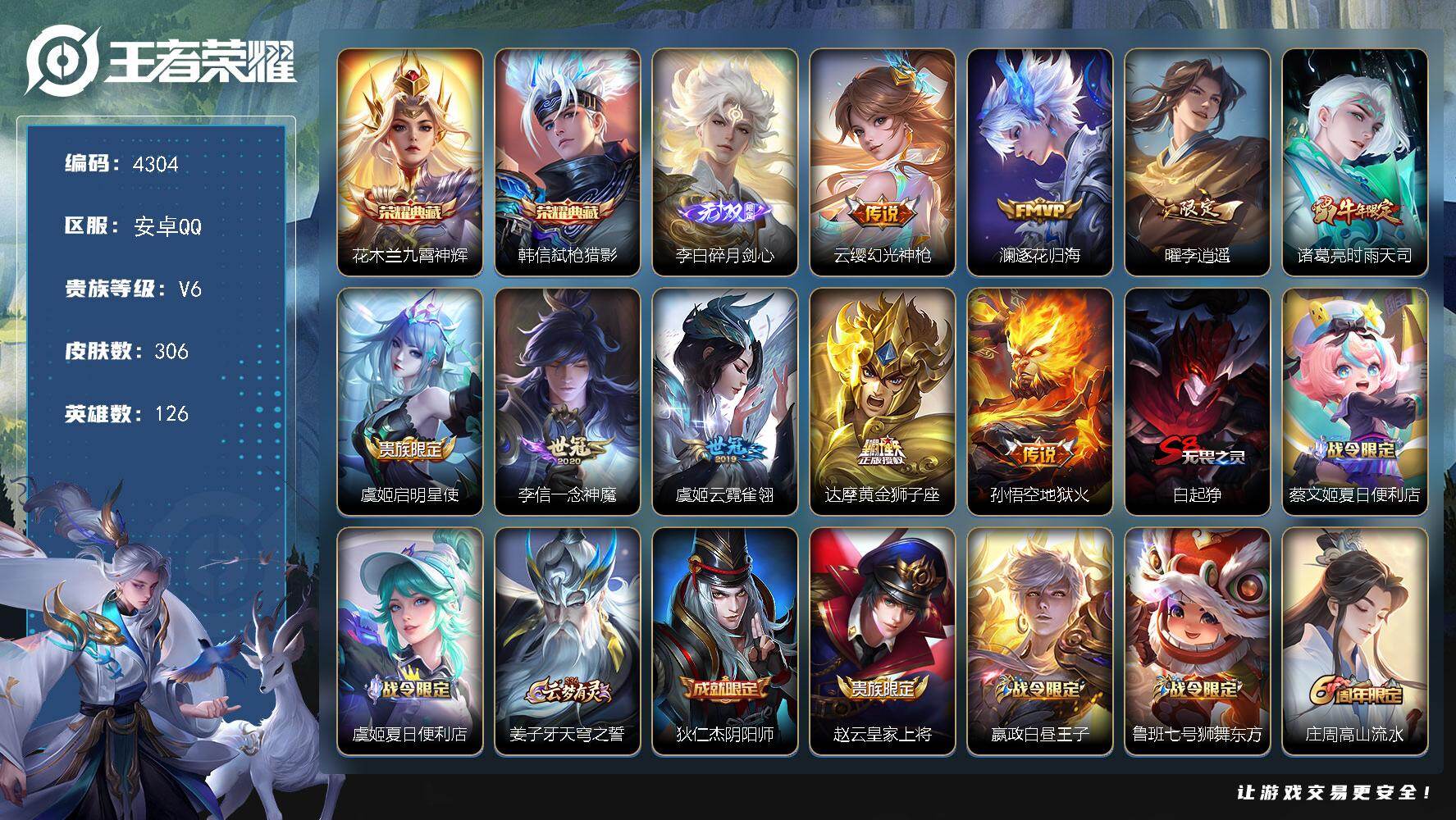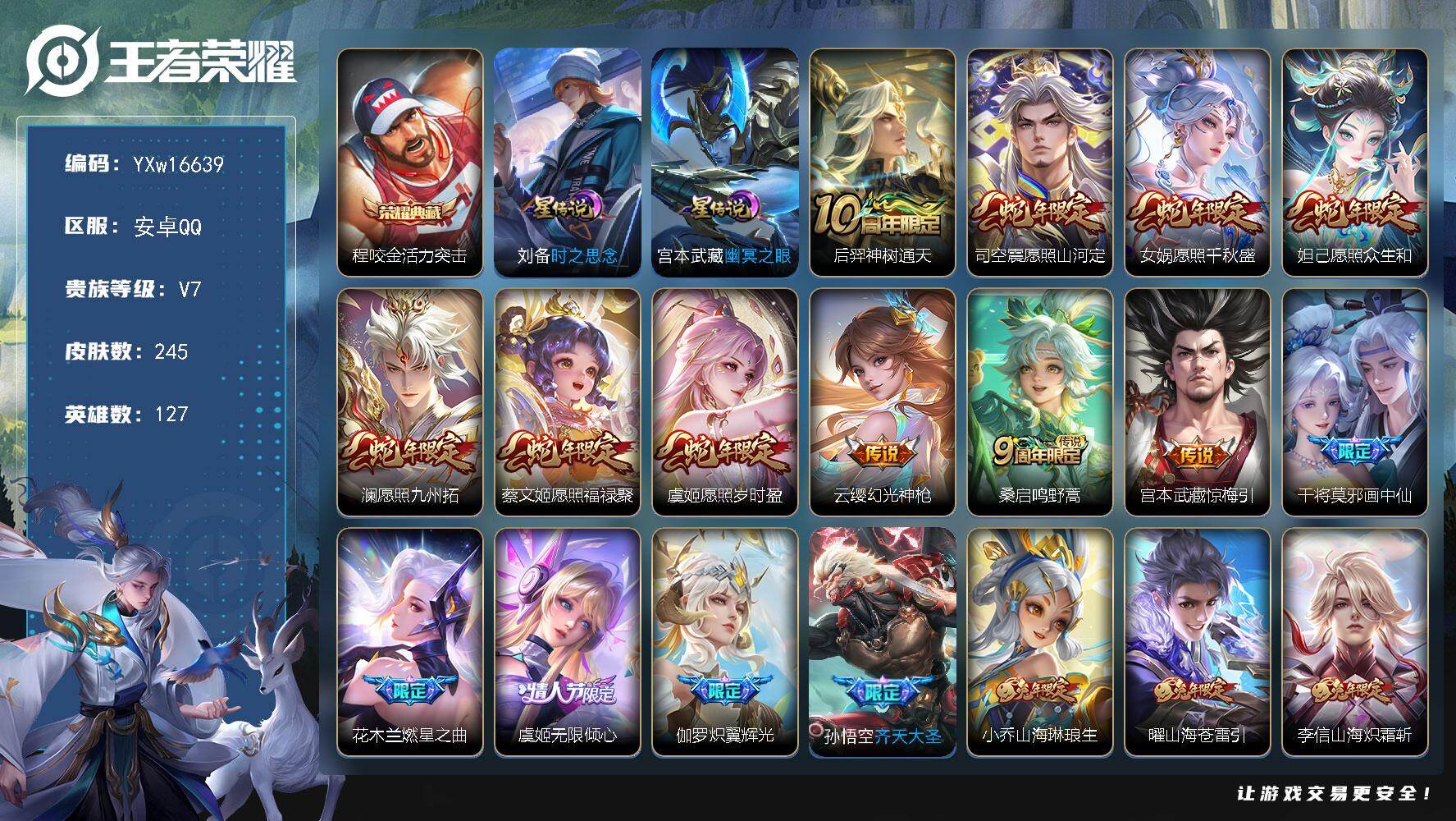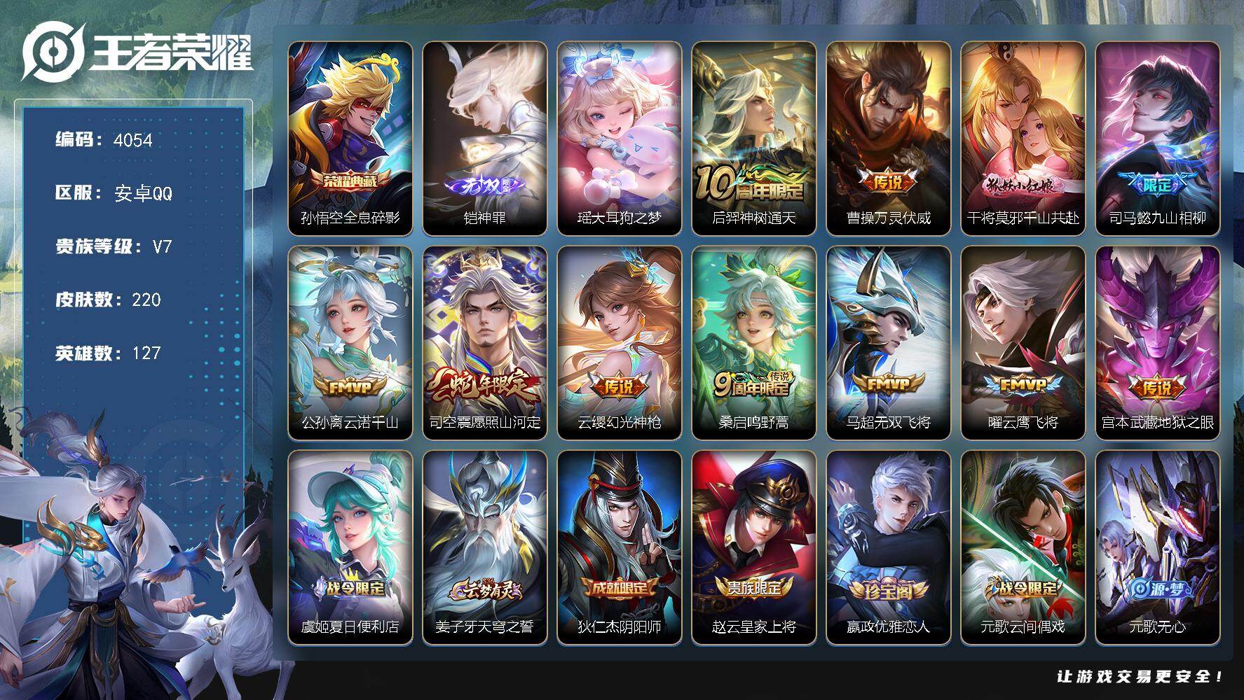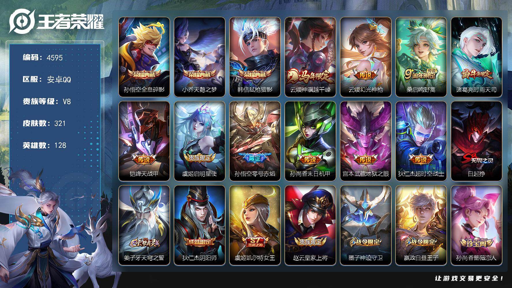 贵族8-贵族积分65957-293皮1典藏11传说1无双-2个英雄全皮 安卓