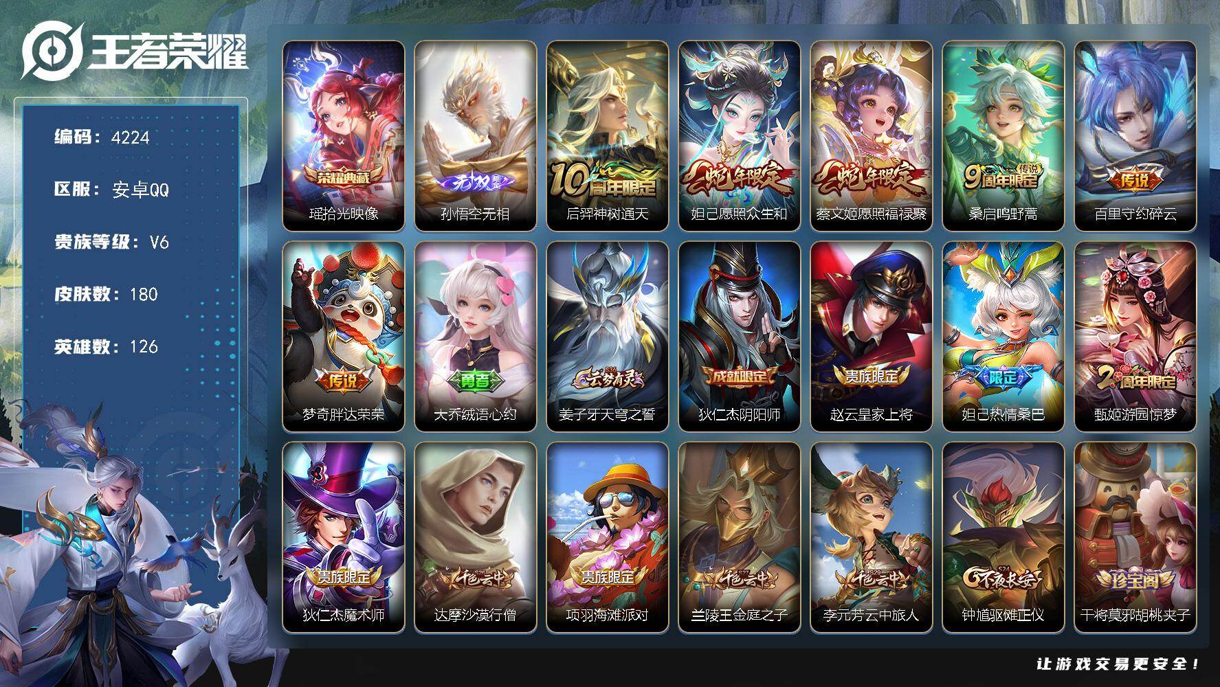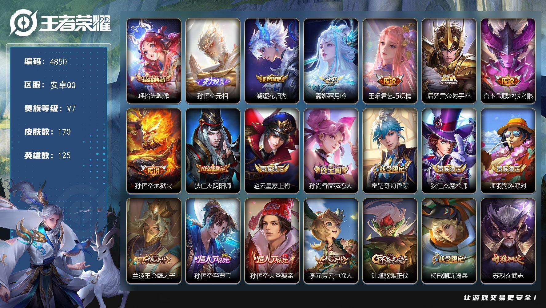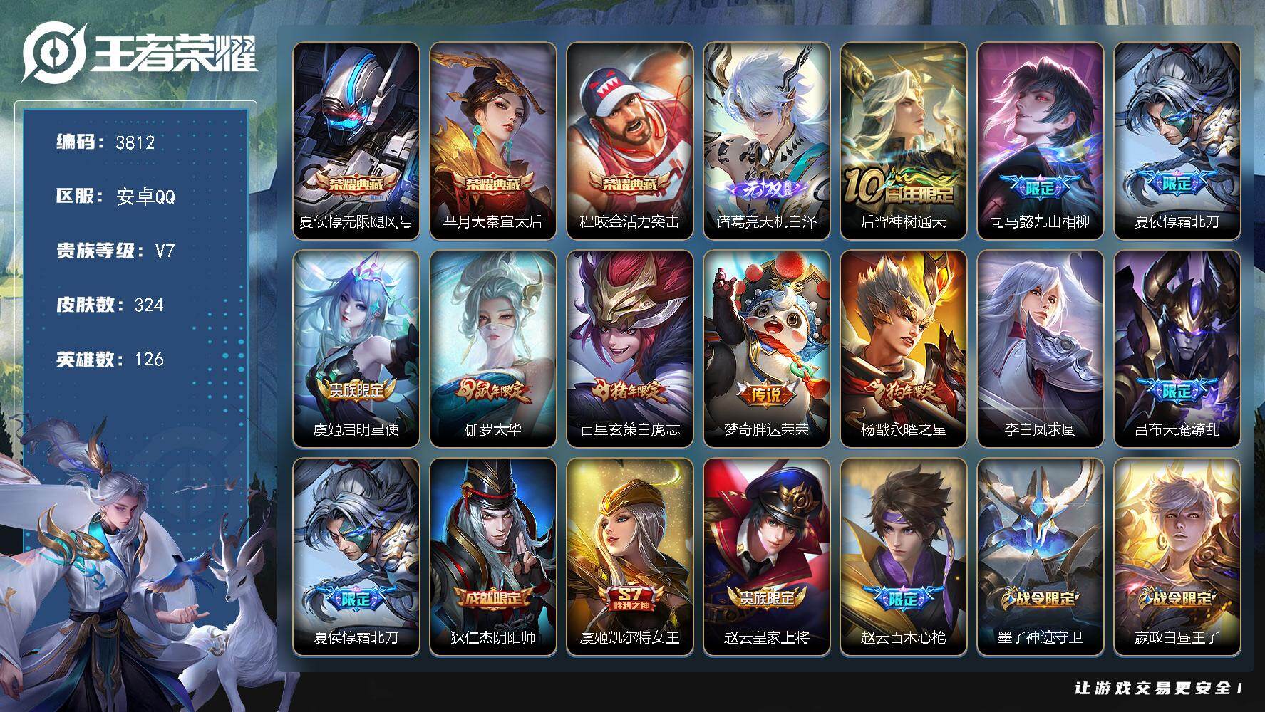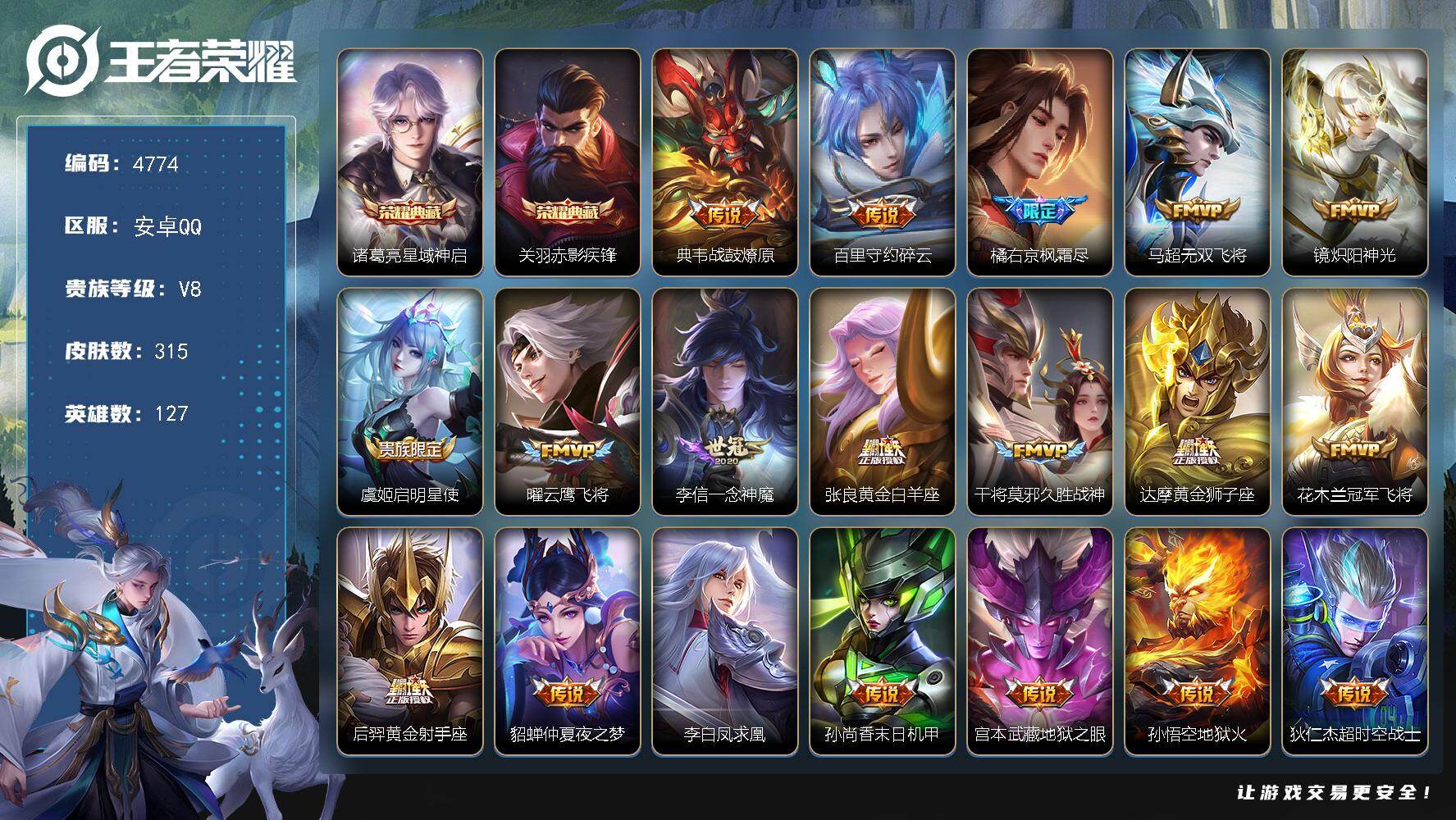 贵族8-贵族积分65957-293皮1典藏11传说1无双-2个英雄全皮 安卓