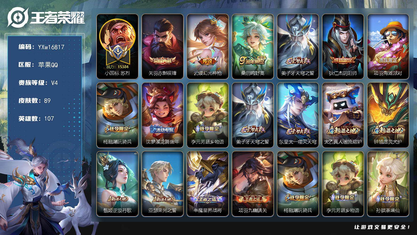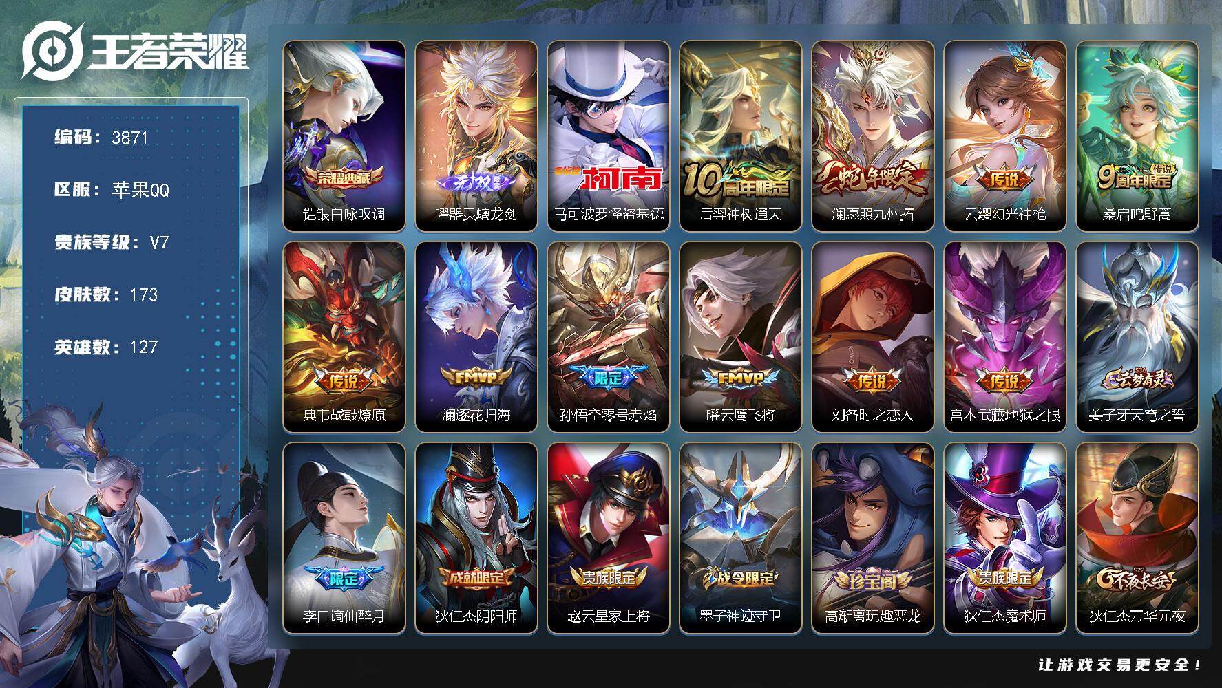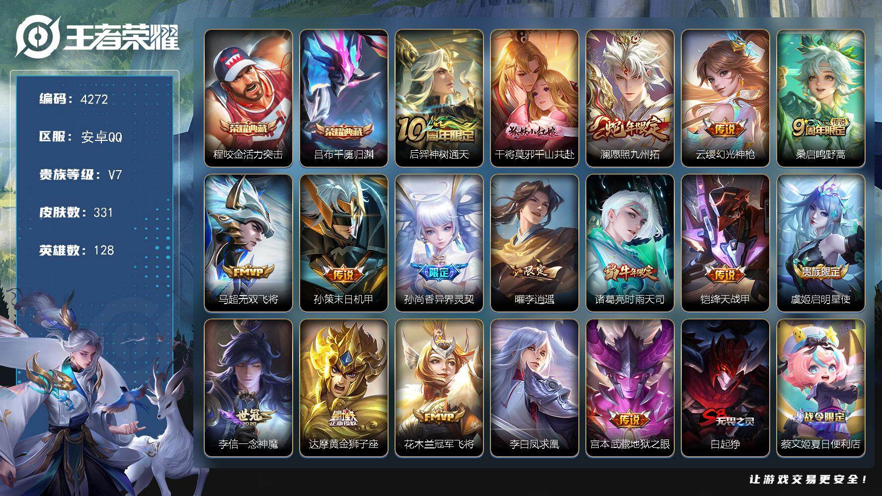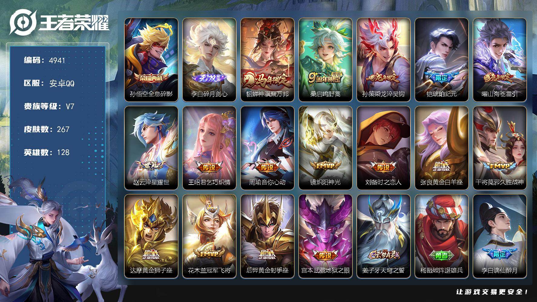 贵族8-贵族积分65957-293皮1典藏11传说1无双-2个英雄全皮 安卓