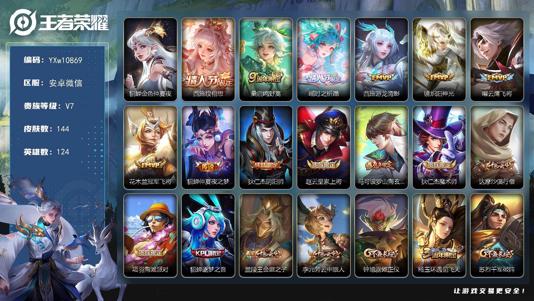 124英雄-144皮肤-10王者印记-140铭文-贵族积分3w