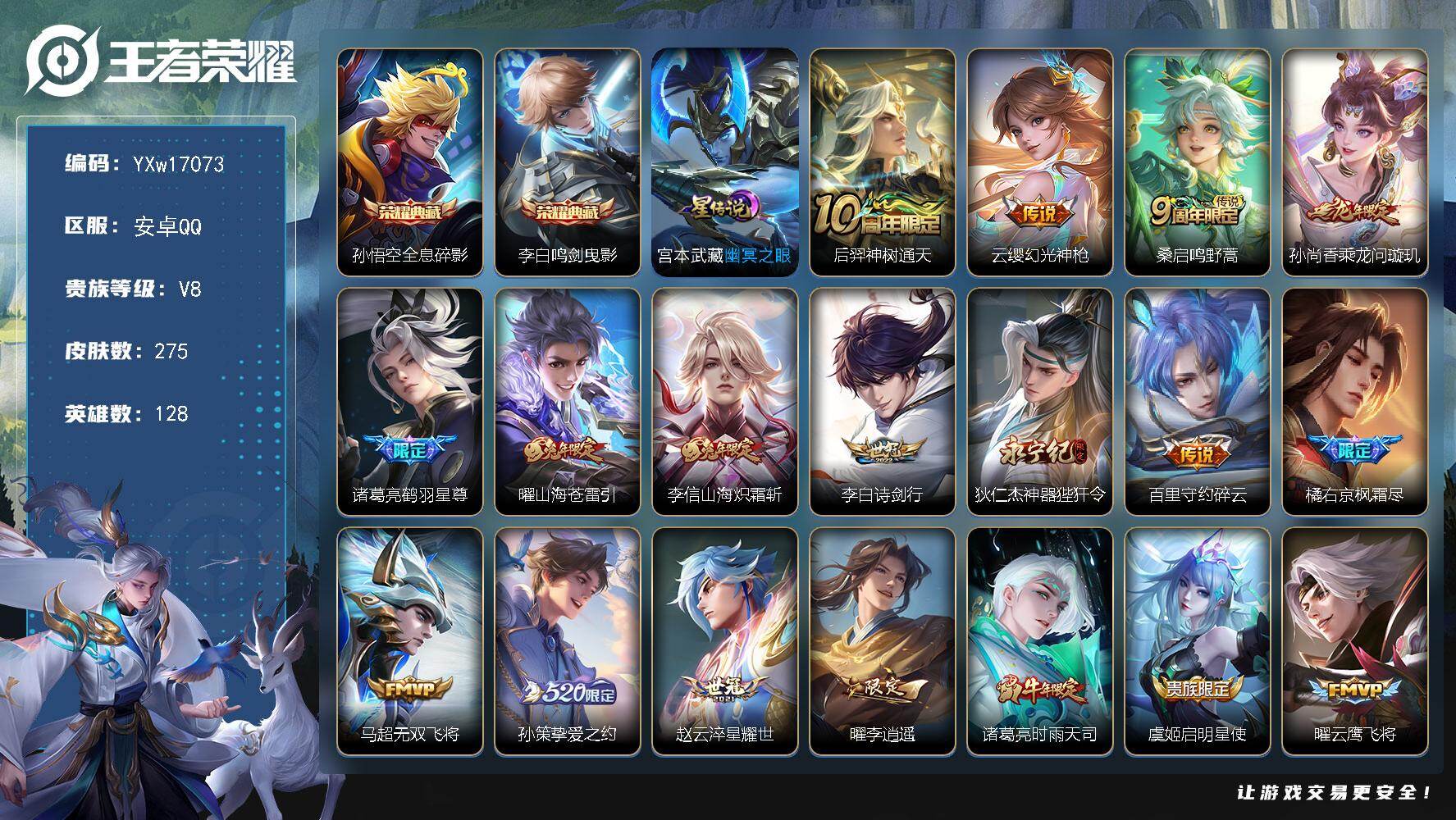 128英雄-275皮肤-10王者印记-300铭文-贵族积分5w