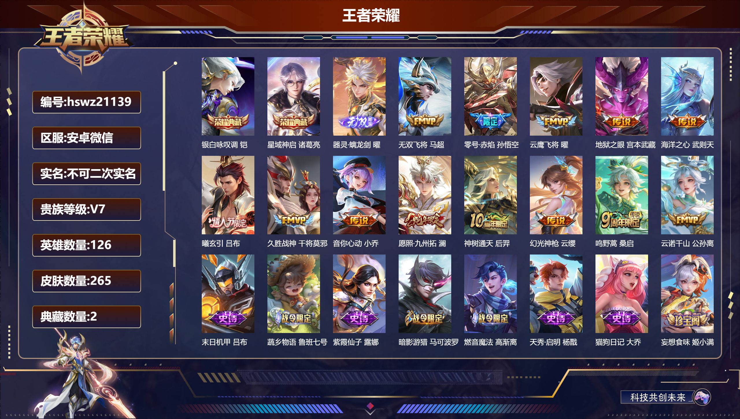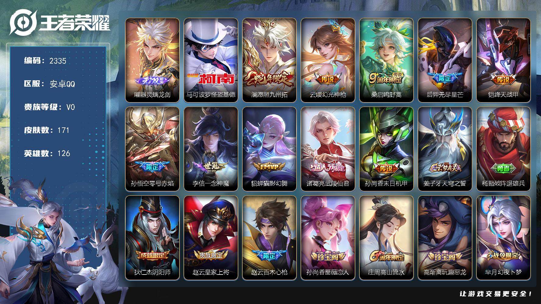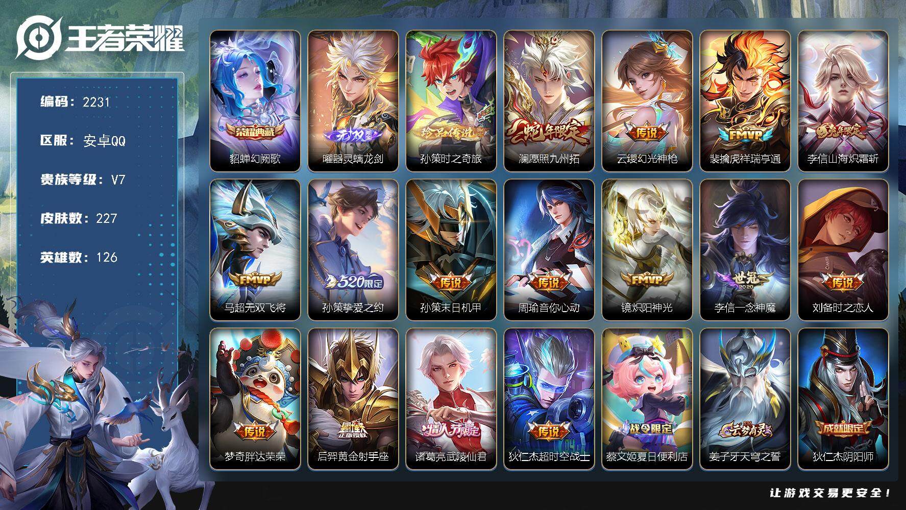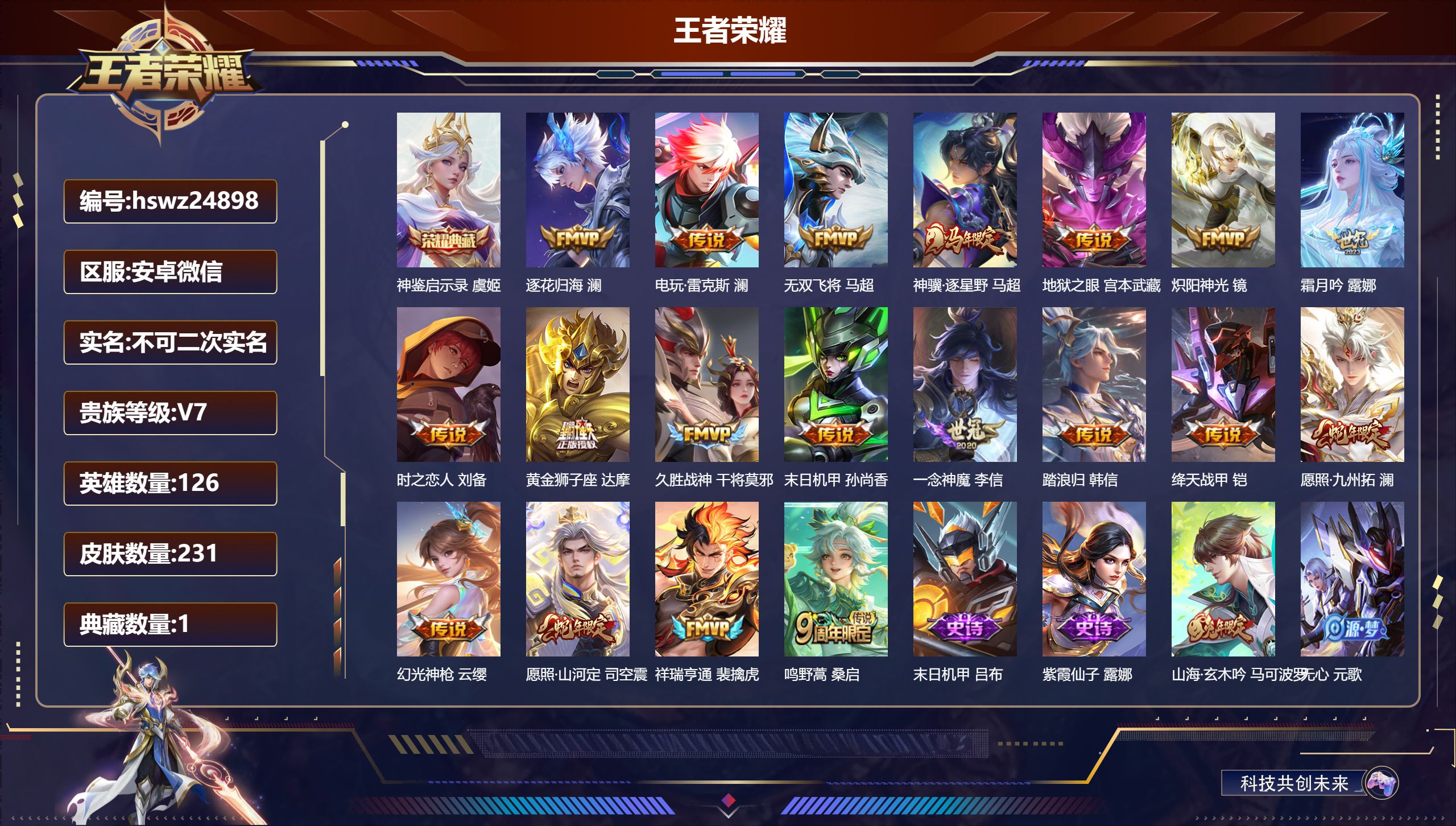 安卓微信/荣耀王者/231皮肤/126英雄/1典藏/0珍品无双/0无双/0珍品传