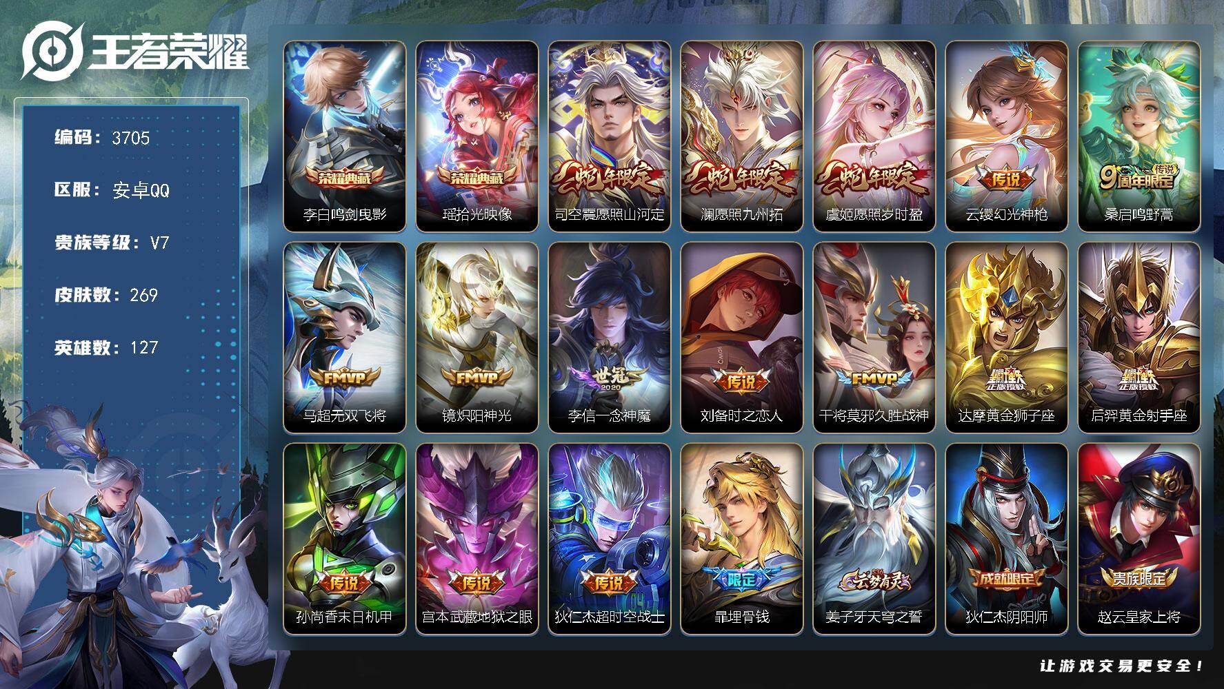 安卓手Q75区270皮1典藏13传说0无双1珍品传说V7