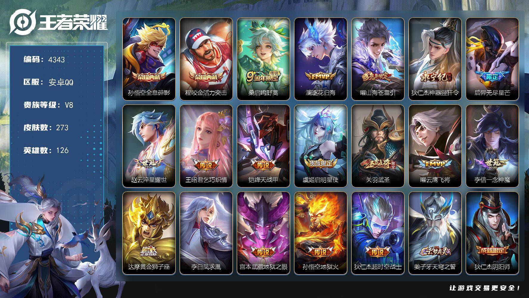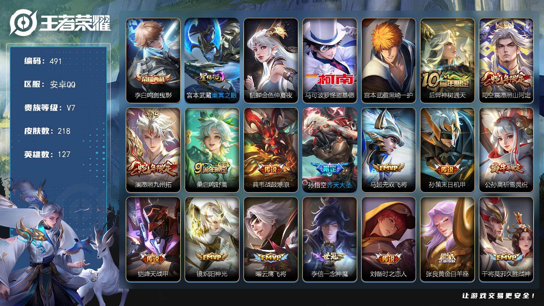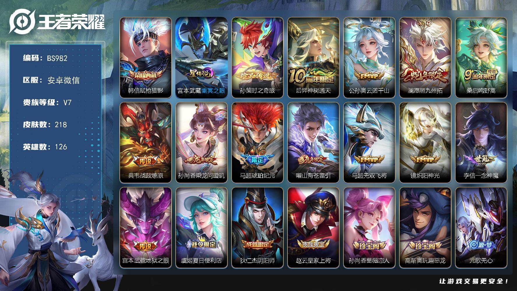 安卓WX-V7-永恒钻石II段位-126英雄-218皮肤-1典藏皮肤-1珍品传说