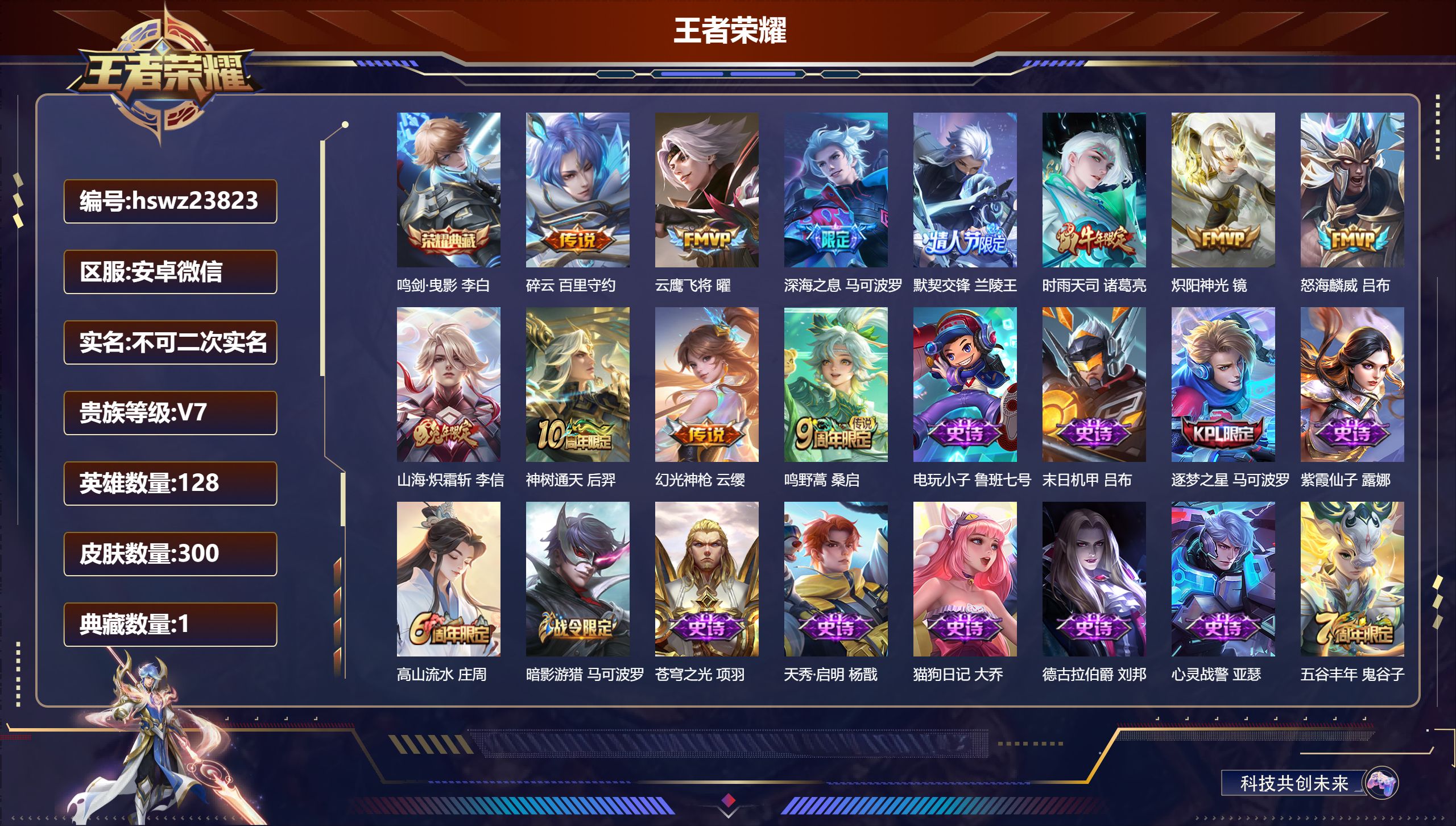300皮肤/128英雄/1典藏/0珍品无双/0无双/0珍品传说/11传说/82史诗/9稀有英雄