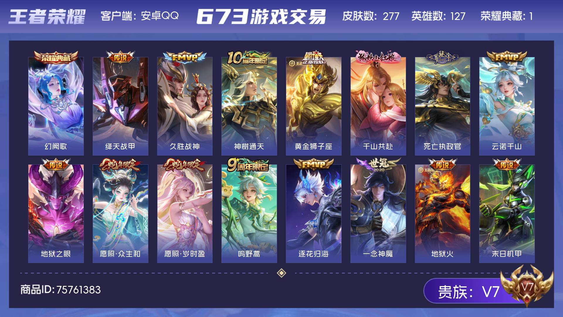 V7 皮肤277 英雄127 至尊星耀 荣耀典藏1 星传说2 传说15 其他皮肤265