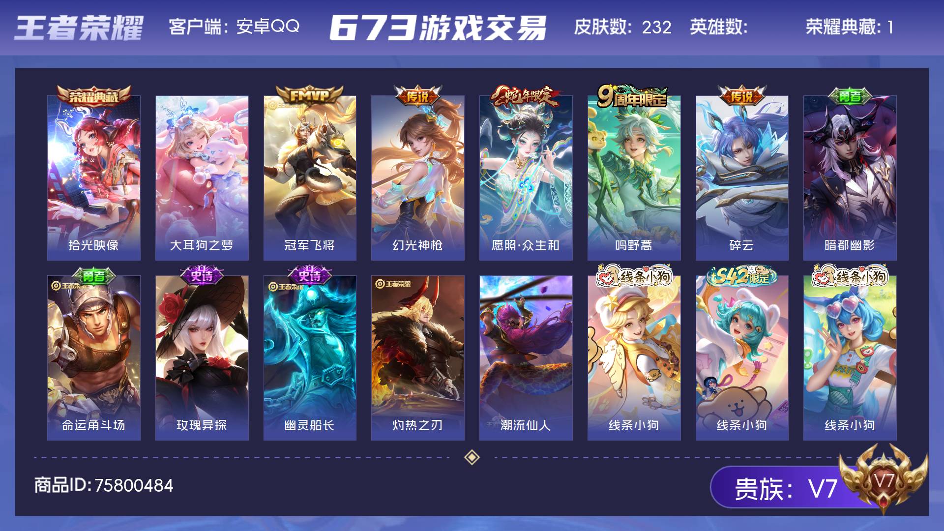 V7 皮肤232 绝世王者 荣耀典藏1 珍品传说1 星传说1 传说5 其他皮肤229