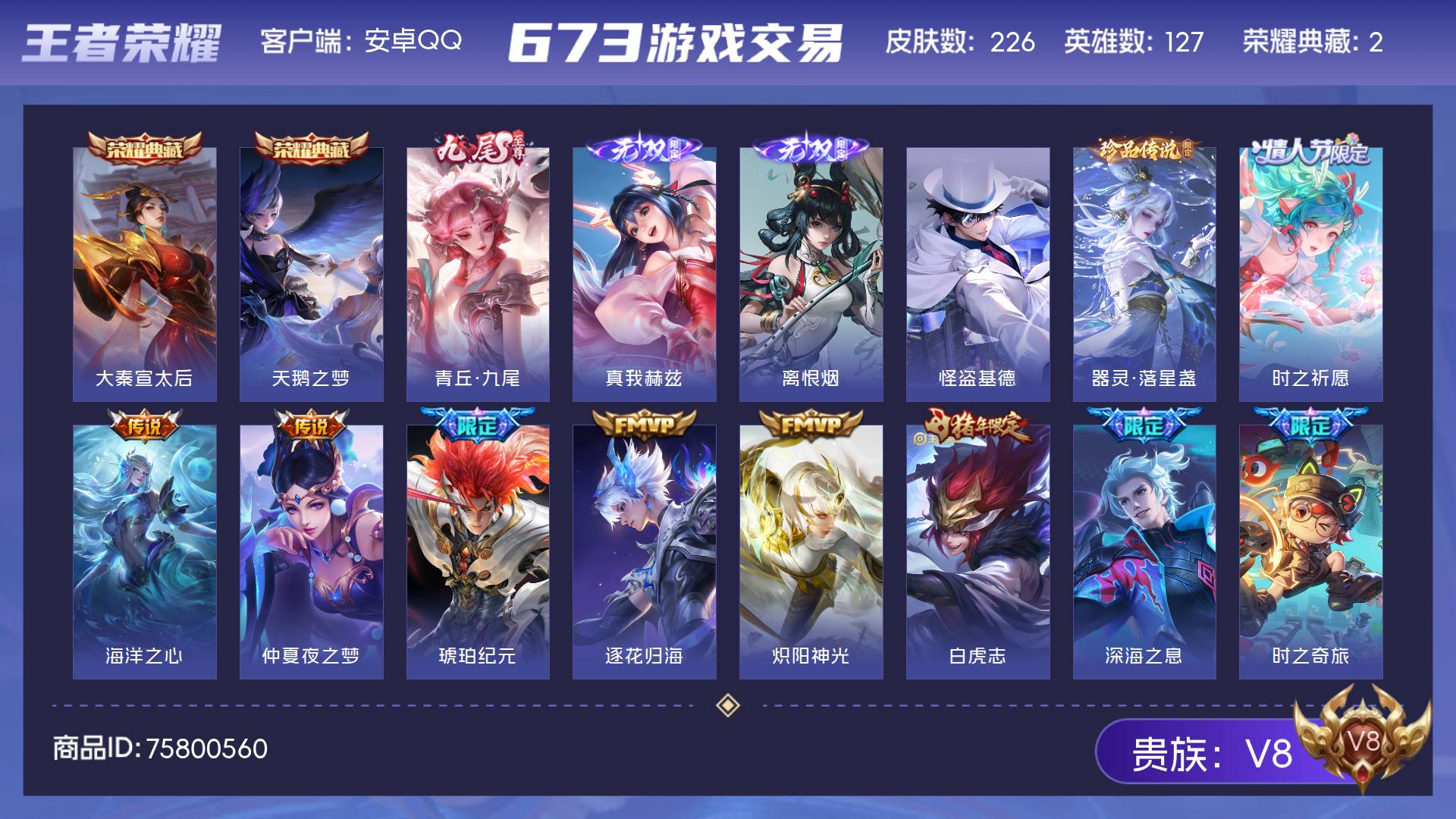V8 皮肤226 英雄127 非凡王者 荣耀典藏2 无双皮肤3 珍品传说2 传说26 其他皮肤194