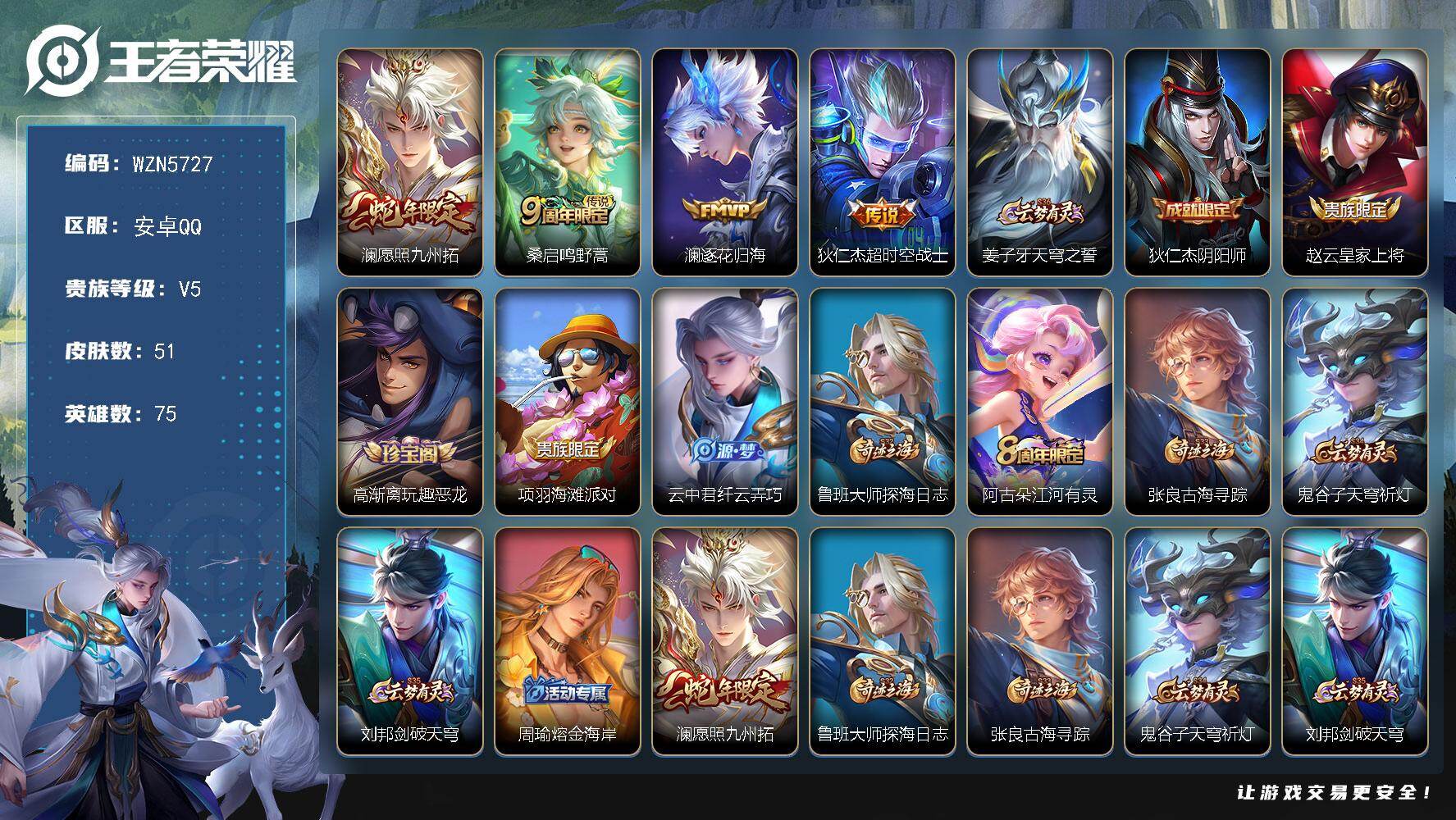 贵族5/皮肤51/传说4/史诗16/英雄75/澜-愿照·九州拓
