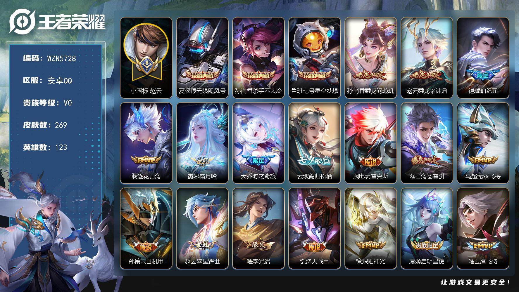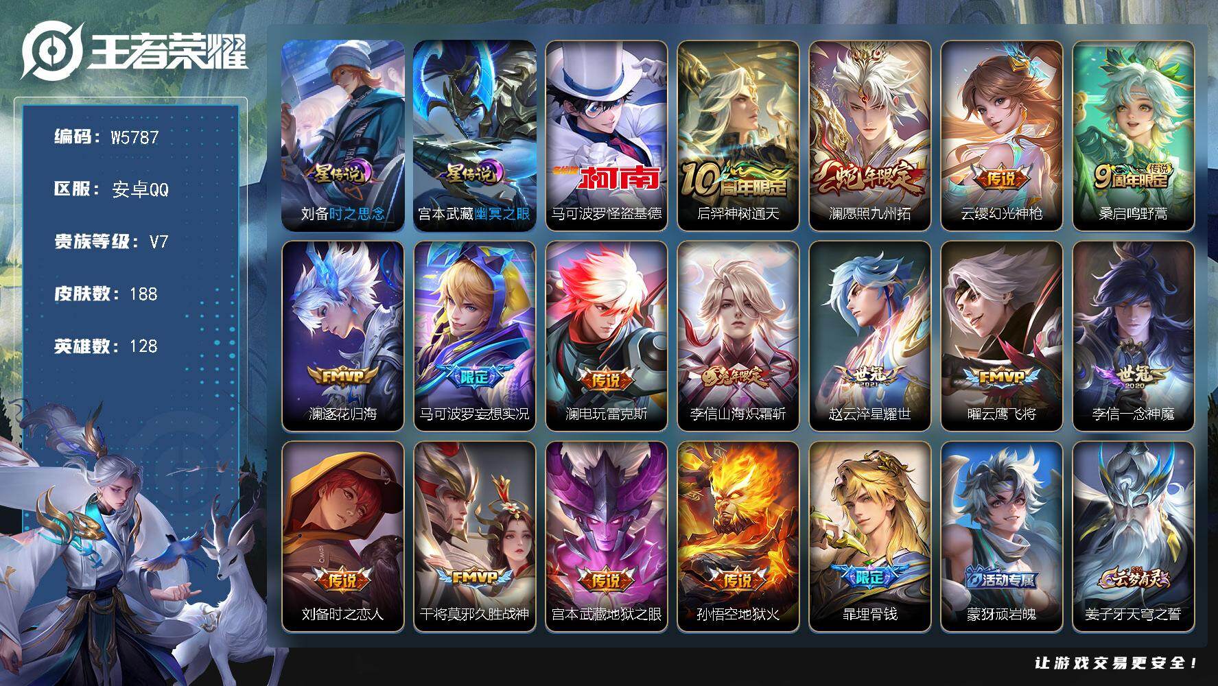 【W5784】安卓Q区-无二次-贵10-128英雄-575皮肤-4典藏-6无双-