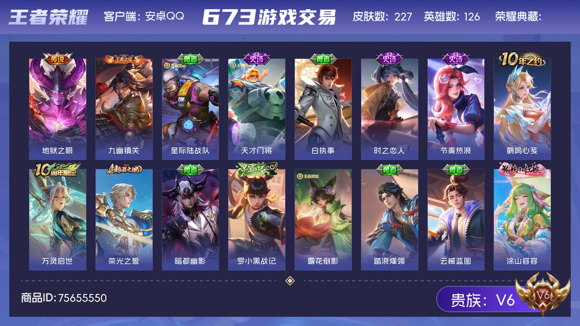 V6 皮肤227 英雄126 至尊星耀 星传说1 传说1 其他皮肤230