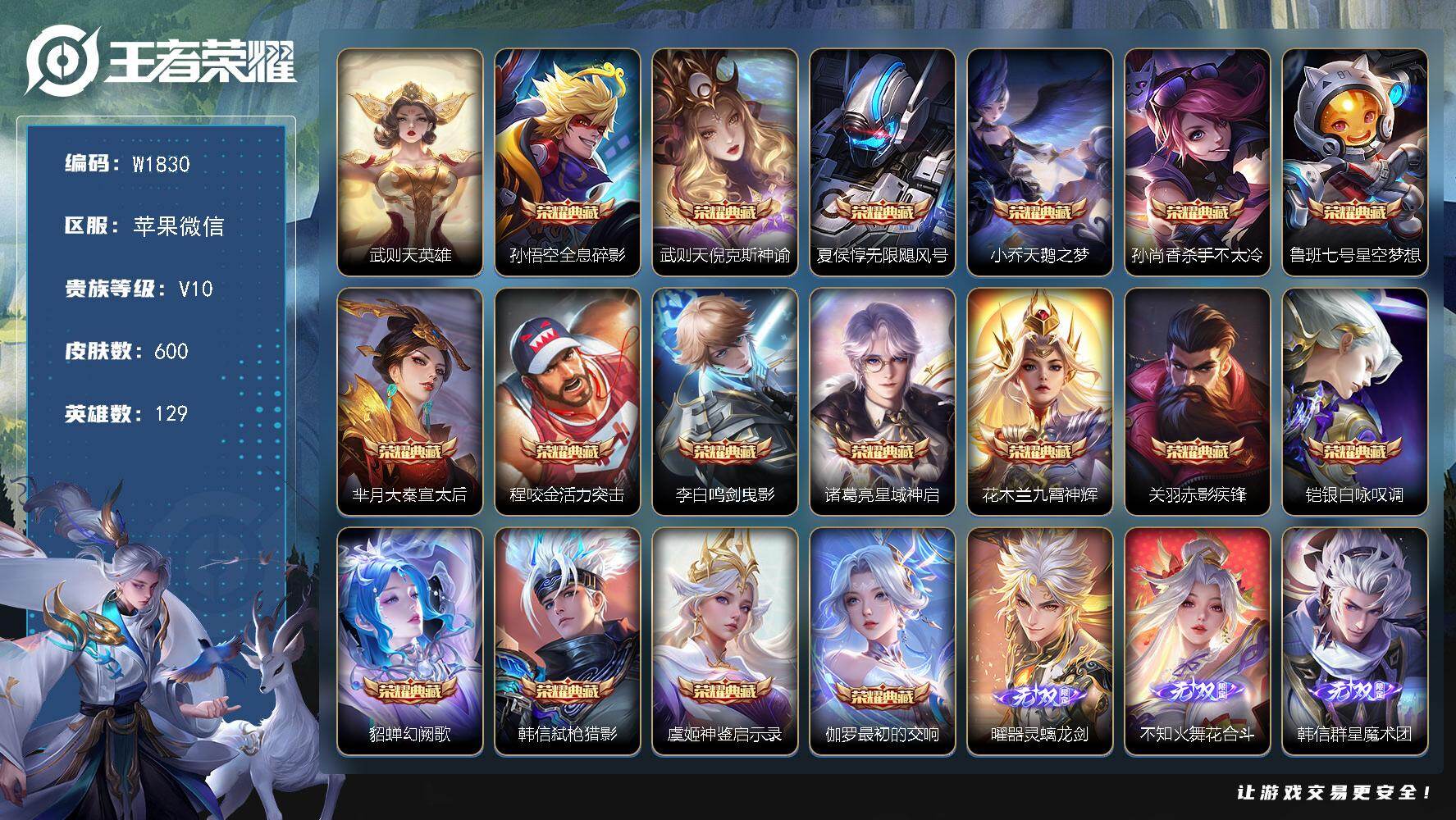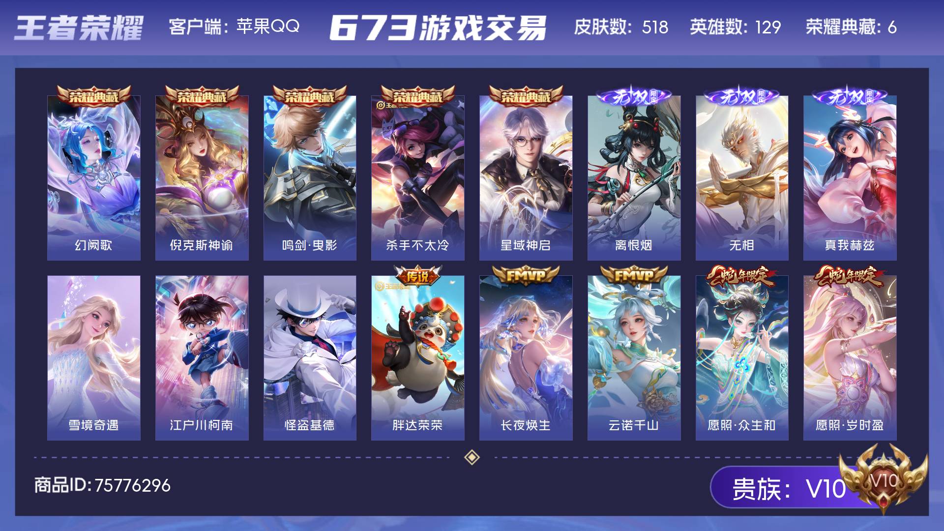 V10 皮肤518 英雄129 至圣王者 荣耀典藏6 无双皮肤4 珍品传说2 传说47 其他皮肤460