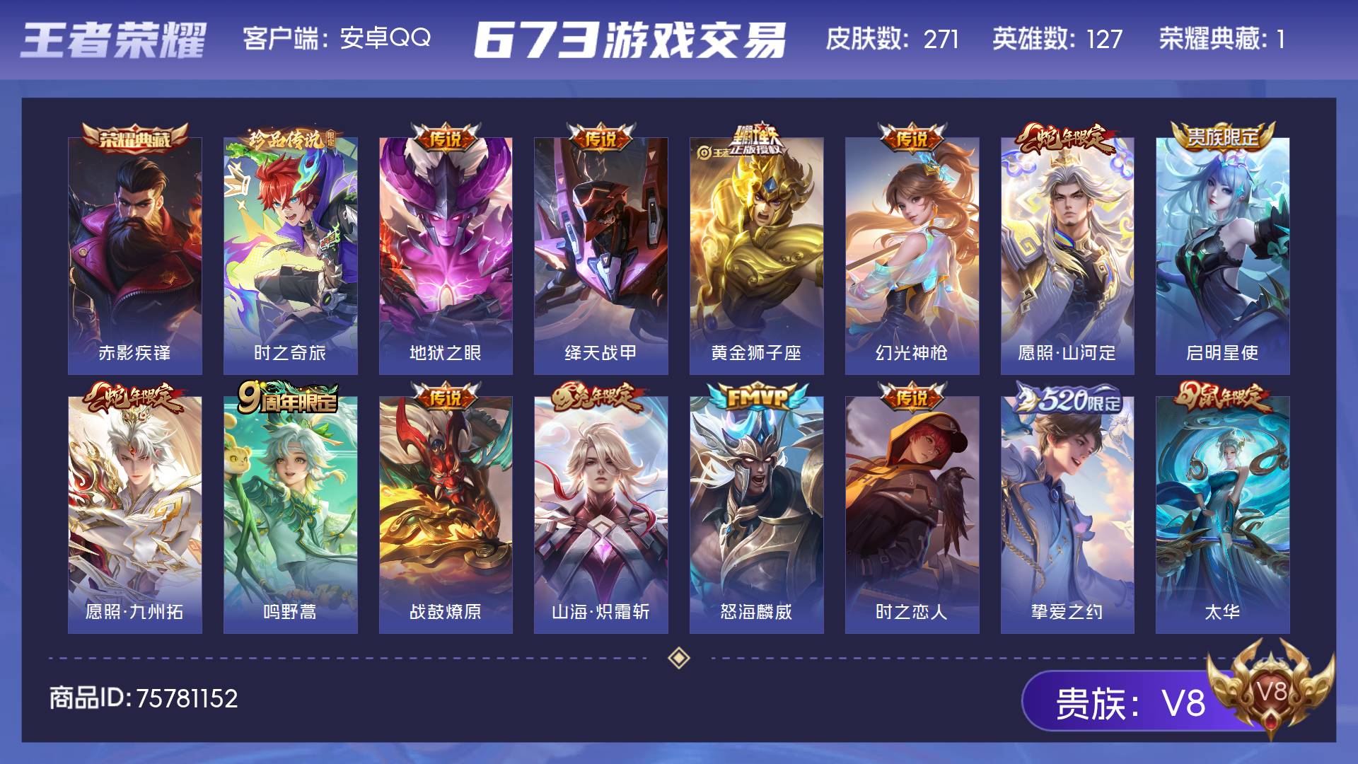 V8 皮肤271 英雄127 永恒钻石 荣耀典藏1 珍品传说1 传说16 其他皮肤258