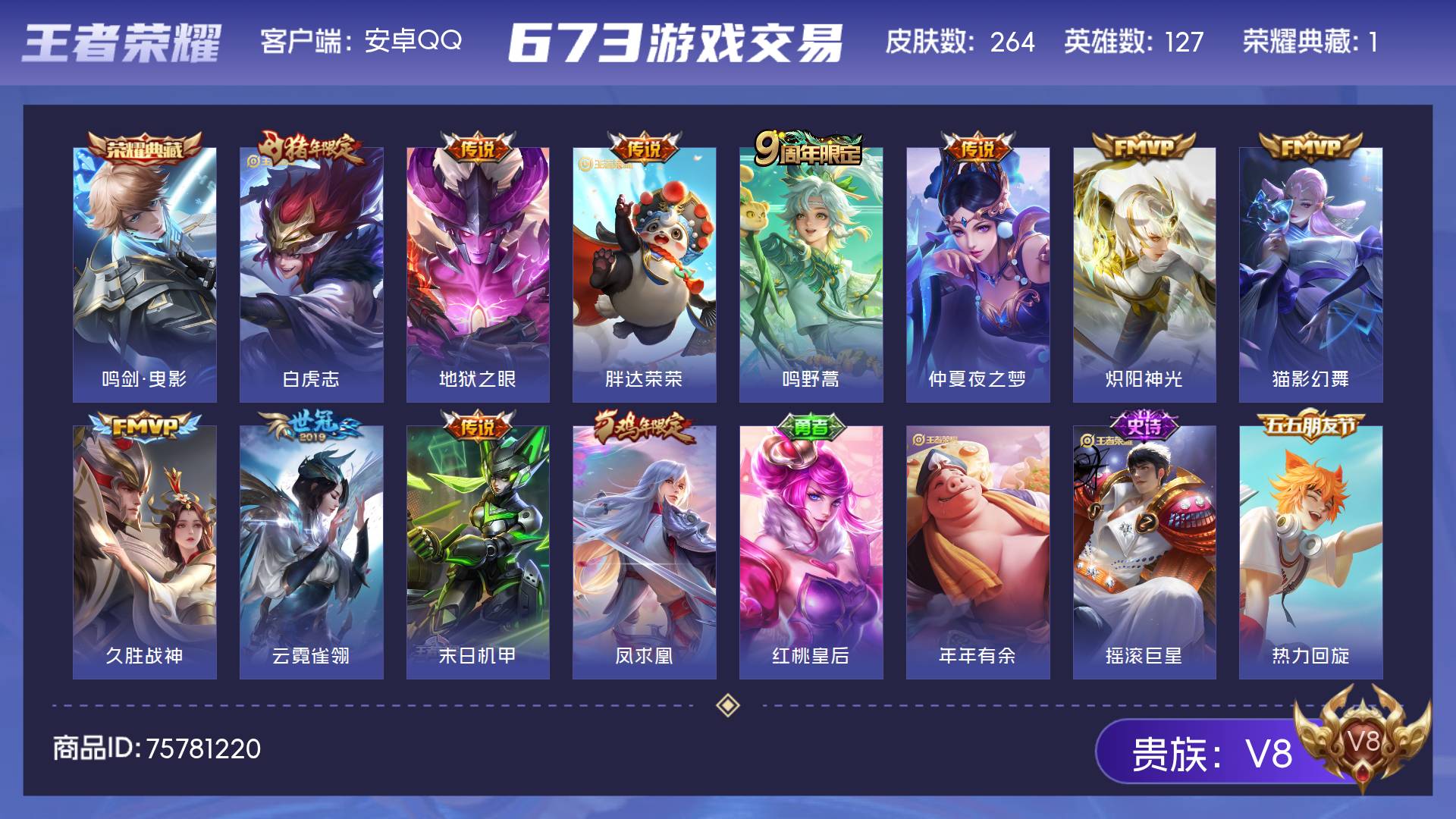 V8 皮肤264 英雄127 至尊星耀 荣耀典藏1 传说11 其他皮肤256
