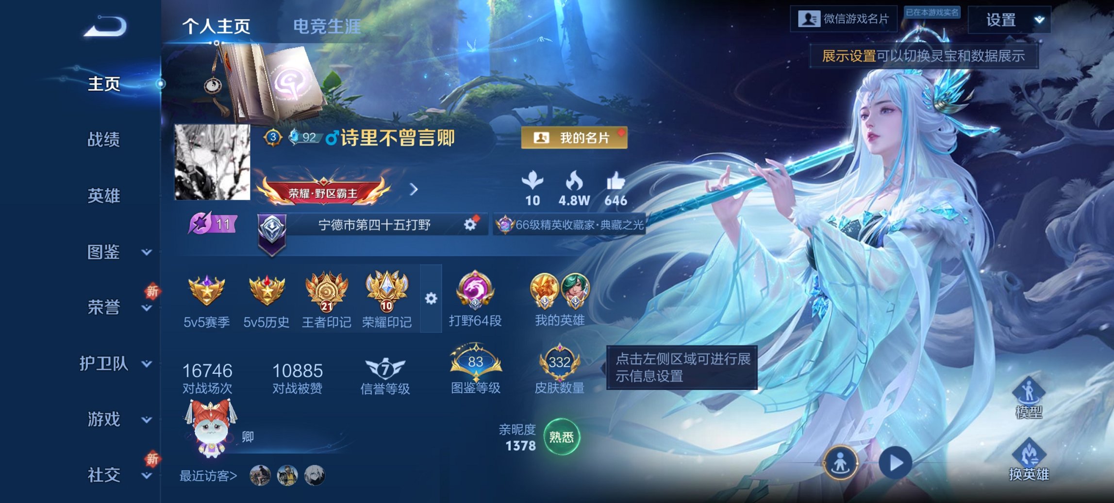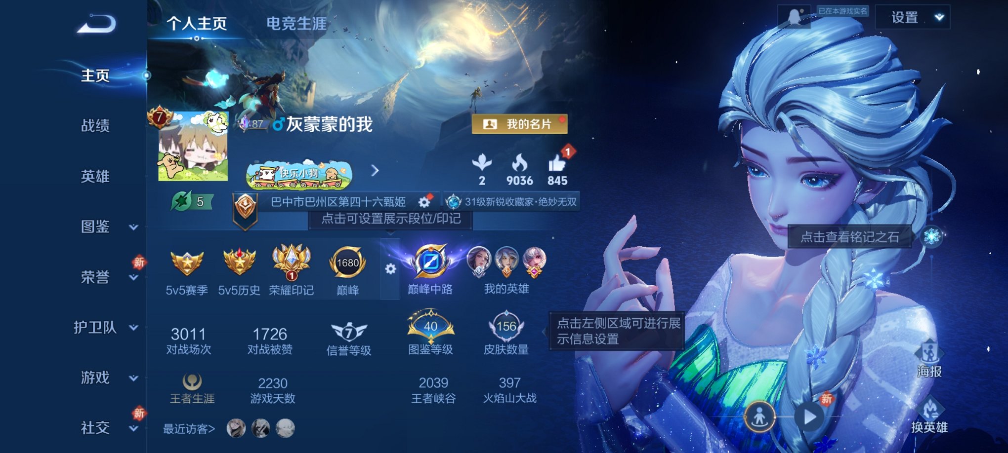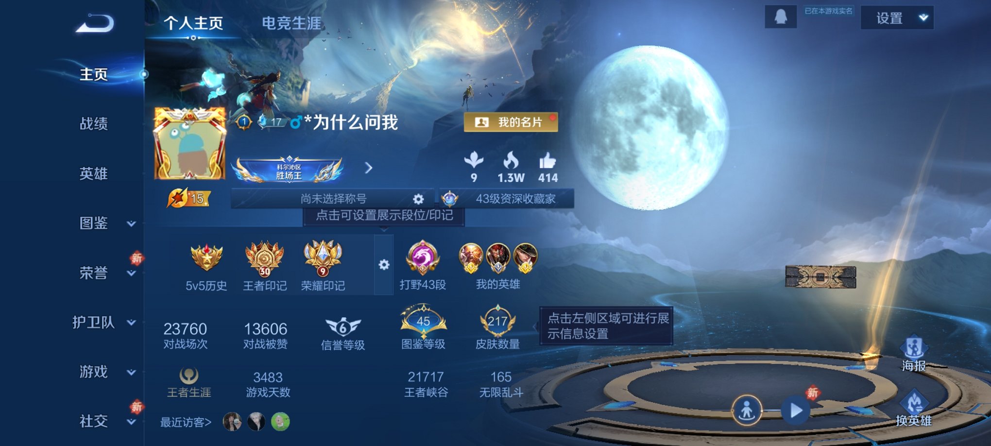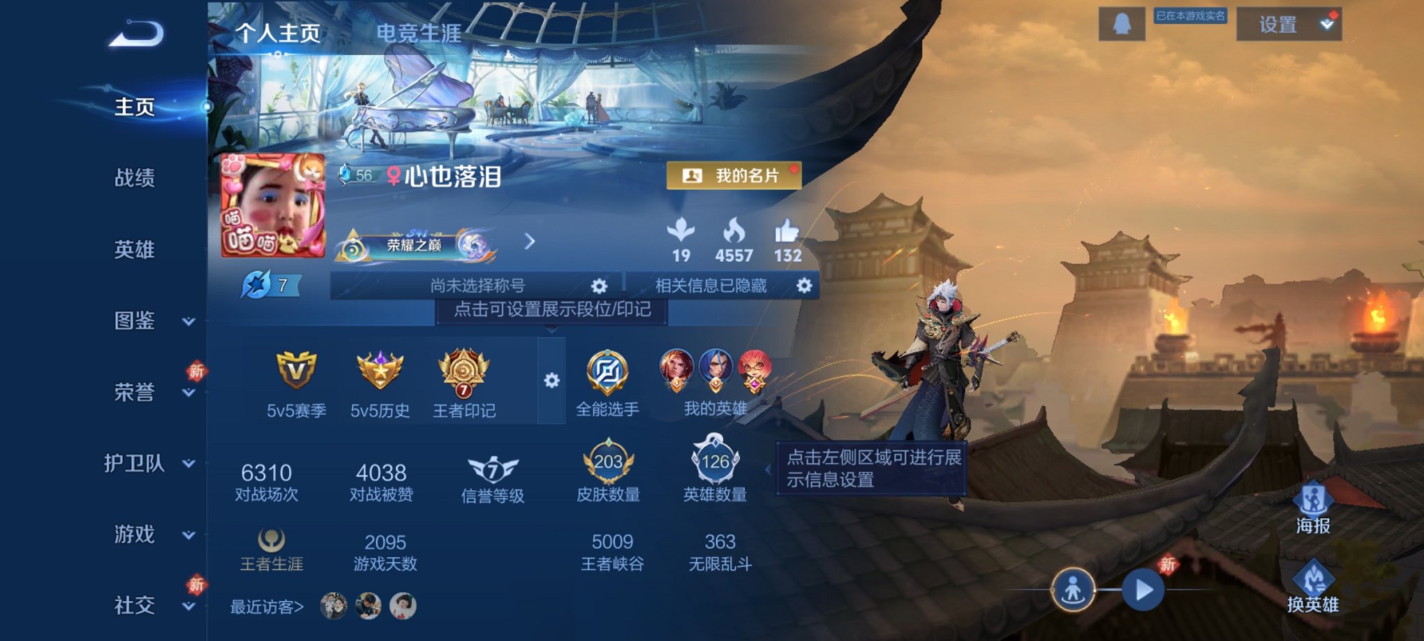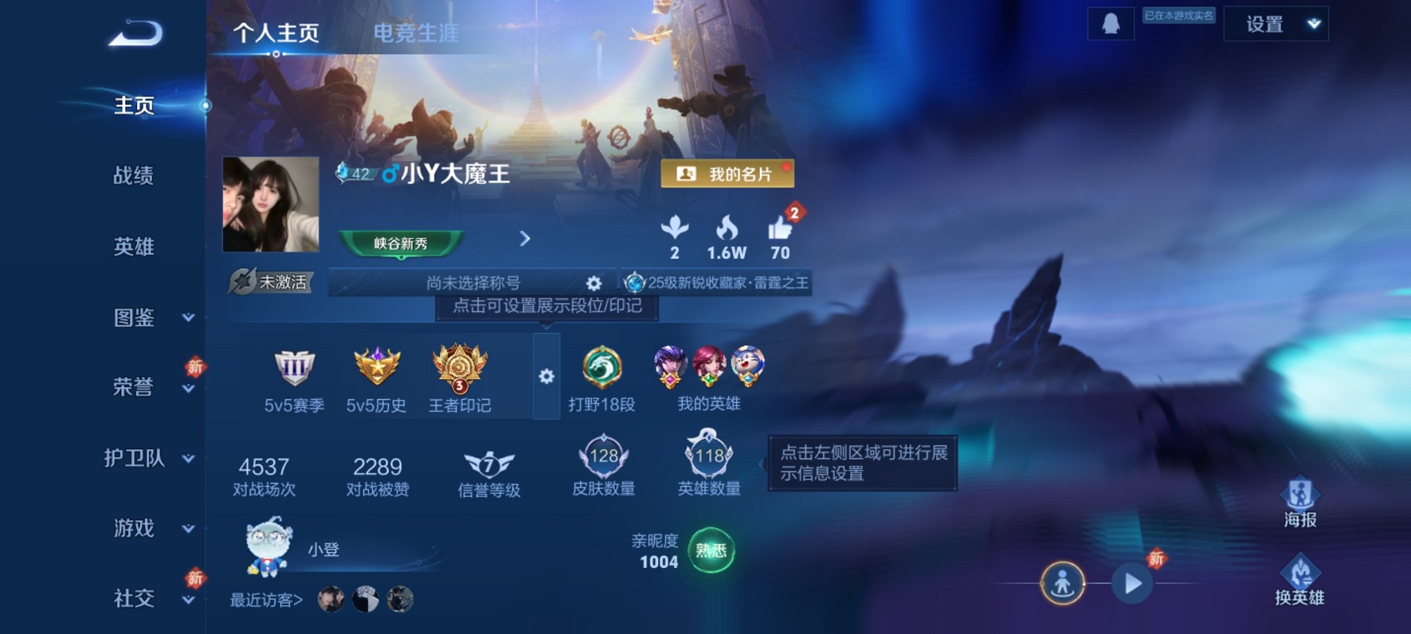 实名: 可修改 贵族等级: V8 英雄数: 128 皮肤数: 274 荣耀水晶