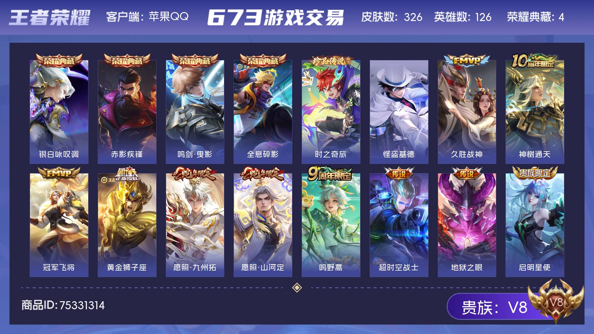 V8 皮肤326 英雄126 至尊星耀 荣耀典藏4 珍品传说2 传说19 其他皮肤306