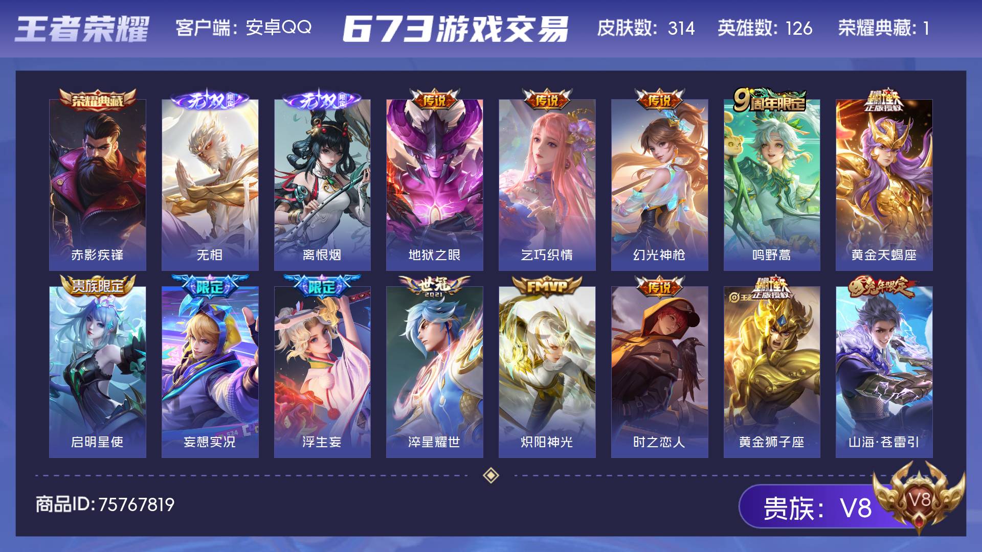 V8 皮肤314 英雄126 非凡王者 荣耀典藏1 无双皮肤2 传说19 其他皮肤296